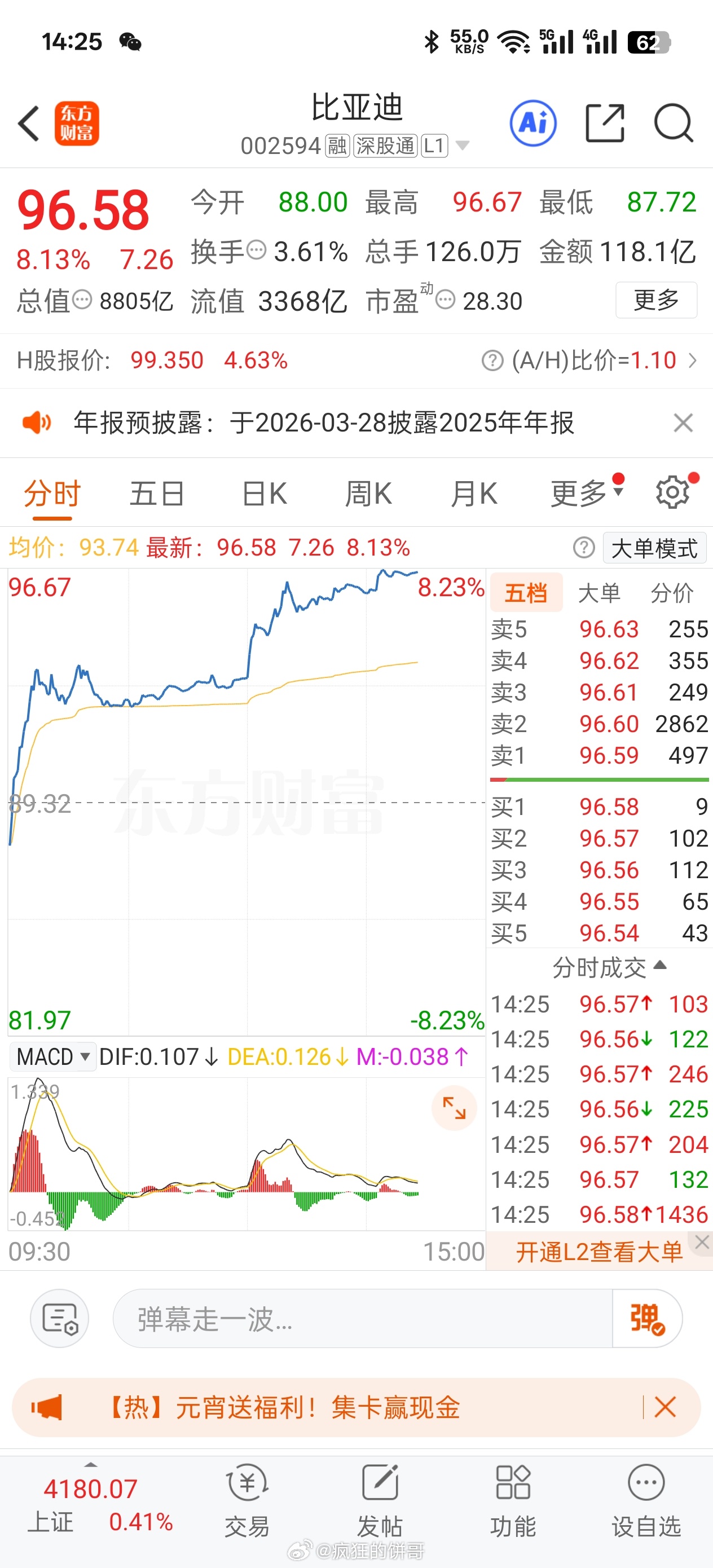 比亚迪股票大涨7%而我刚刚看了下大涨了8%!!2026年3月5日比亚迪将发布颠覆性技术,选在惊蛰这天搞事情,这是要唤醒什么东西?难道去年王传福说的更惊艳的技术,3月5日要现真身了吗?