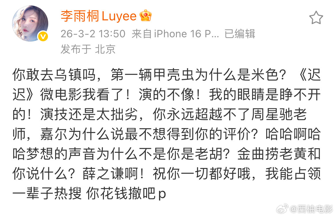 随后,有网友现身李雨桐最新微博评论区留言:“前几条微博怎么不见了?删了吗?心虚了?”