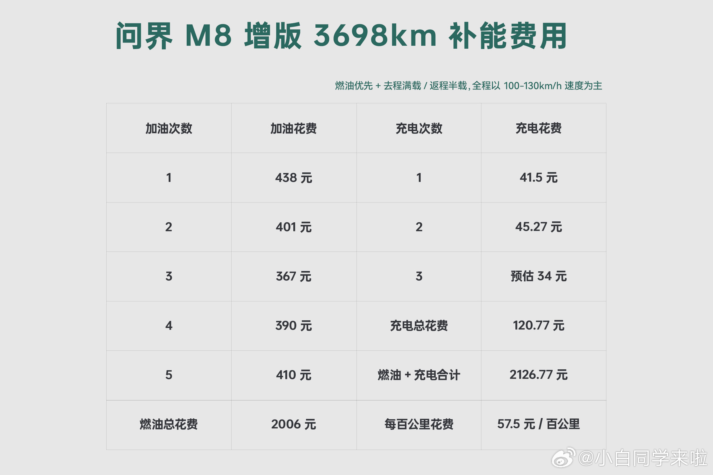 「以燃油为主长途出行 3700km 问界 M8 六座版补能费用要多少」?