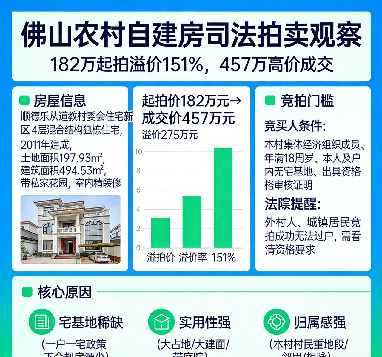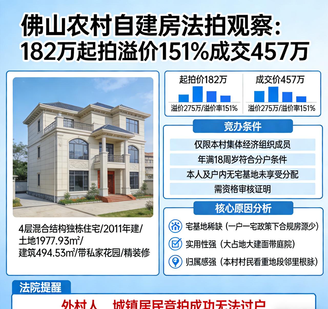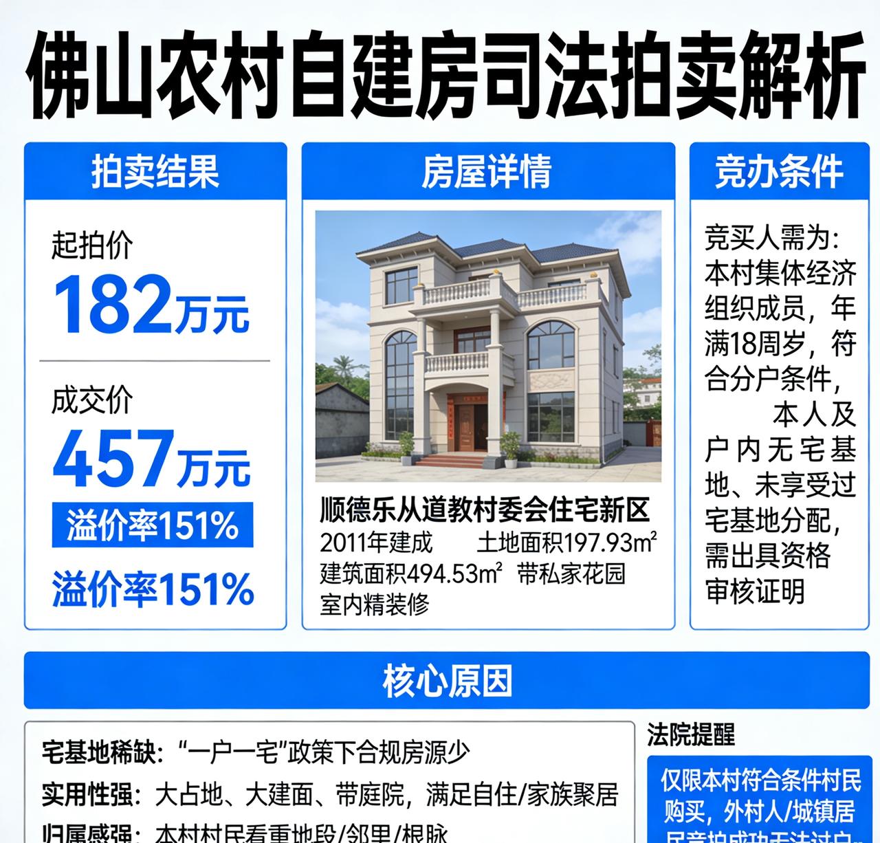 限本村人买!佛山农村自建房182万起拍,溢价151%拍出457万高价。 仅限本村村民竞拍、严格“一户一宅”门槛,依然挡不住佛山村民对自家宅基地自建房的热情。近日,佛山顺德乐从一栋农村宅基地自建房司法拍卖引发热议:起拍价182万元,经过多轮激烈竞价,最终以457万元高价成交,溢价超275万元,溢价率高达151%。 这栋法拍房位于顺德乐从道教村委会住宅新区,为4层混合结构独栋住宅,2011年建成,土地面积197.93㎡,建筑面积494.53㎡,带私家花园,室内精装修,保养较好,相当于村内独栋别墅,居住舒适度高。 因房屋占用土地为农村宅基地,所有权归村集体,按照佛山宅基地管理规定与法院拍卖要求,本次竞拍设置严格门槛: - 竞买人必须是本村集体经济组织成员 - 年满18周岁,符合分户条件 - 本人及户内无宅基地、未享受过宅基地分配 - 需出具资格审核证明,城镇居民与外村人一律不得参与 即便准入条件严苛,仍吸引大量符合资格的本村村民参与竞价。从182万起拍,经过百余轮“子弹式”加价,最终成交价远超评估价,刷新当地同类法拍房热度。 业内人士表示,佛山农村自建房拍卖持续火爆,核心原因有三点:一是宅基地稀缺,“一户一宅”政策下,村内合规独栋房源越来越少;二是实用性强,大占地、大建面、带庭院,满足自住、家族聚居需求;三是归属感强,本村村民更看重地段、邻里与根脉,愿意为优质房源付出高溢价。 法院提醒,农村宅基地法拍房仅限本村符合条件村民购买,外村人、城镇居民即便竞拍成功也无法过户,务必看清资格要求再参与。同时,这一现象也折射出:在佛山,优质村宅依然是硬通货,村民对家乡资产的认可度持续走高。广州农村自建房 佛山南海自建房 佛山自建房出售 佛山三水自建房