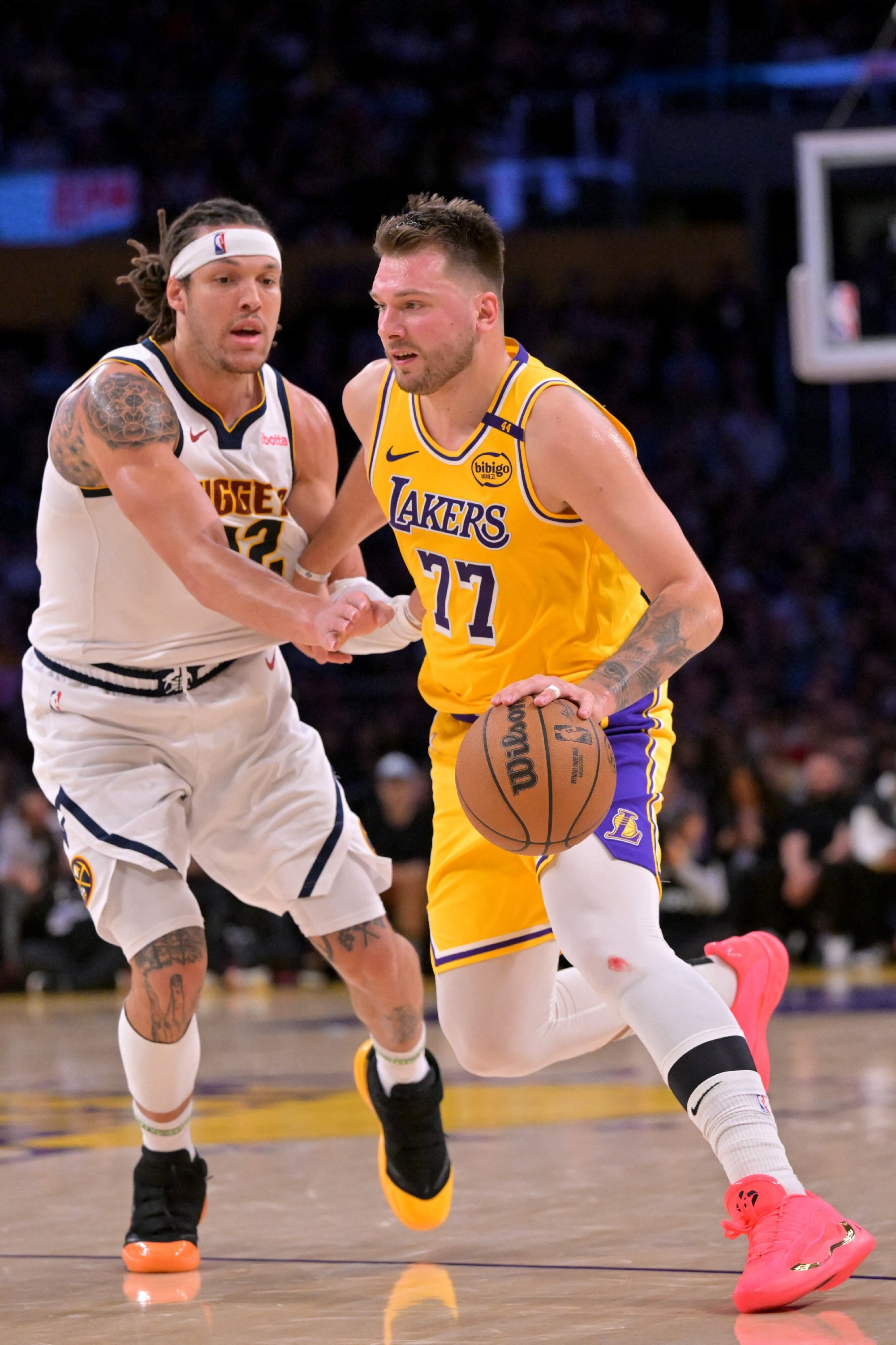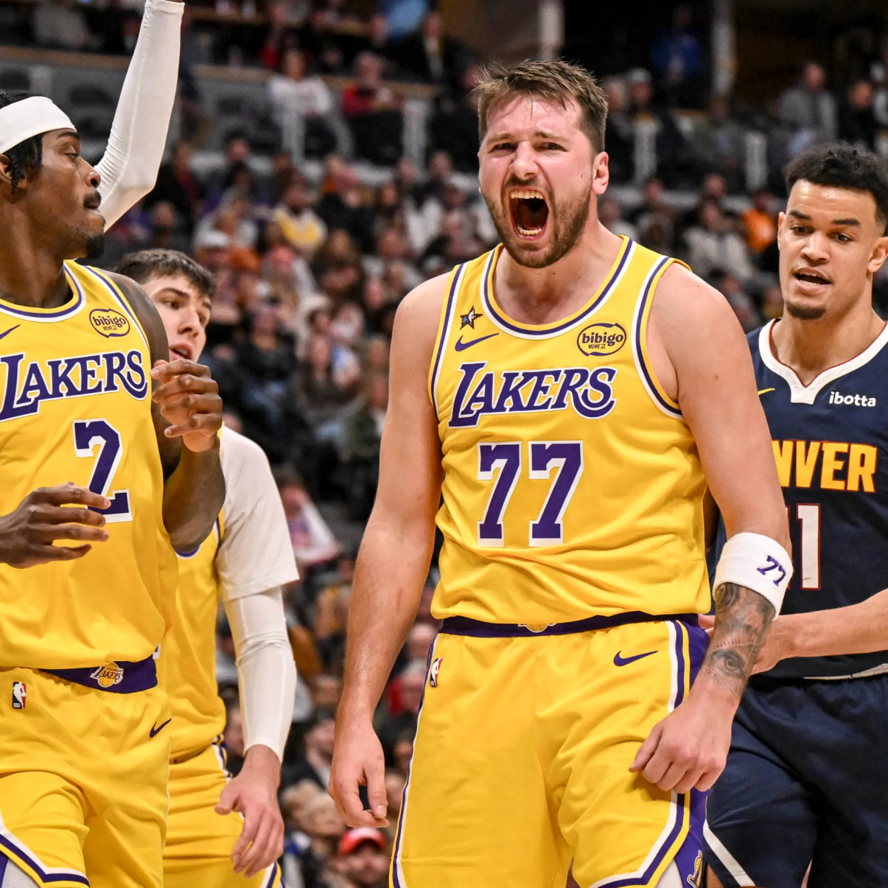 加盟湖人以来,在东契奇出战的三场与掘金的比赛中,湖人全都获胜。东契奇场均33.7分10.3篮板8.7助攻2.7抢断,投篮命中率50%,三分命中率40.7%,罚球命中率86.7%,场均正负值+12.7。
