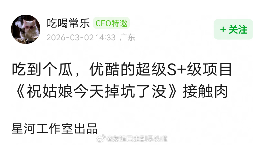 🍉:优酷超级S+《祝姑娘今天掉坑了没》接触赵露思,大女主+无cp,女主女扮男装进入官场,靠自己走到朝堂中心,一路升职到丞相。