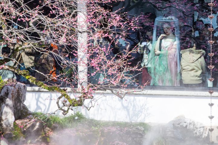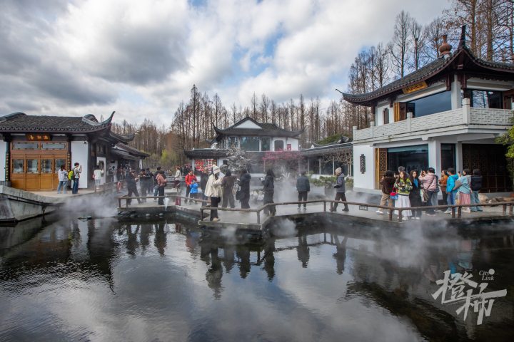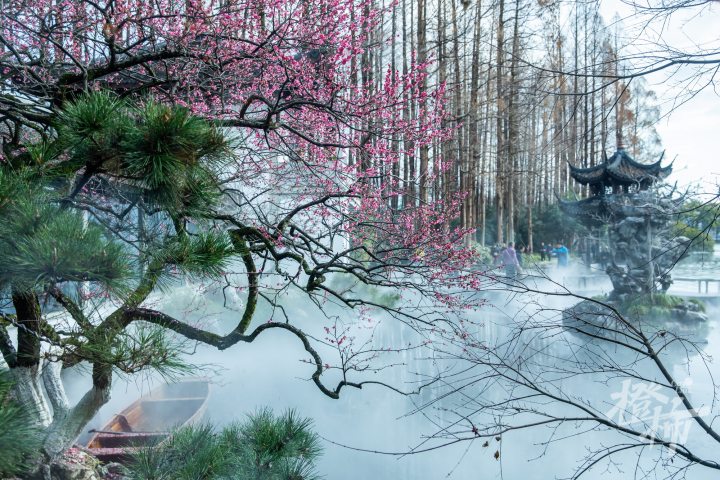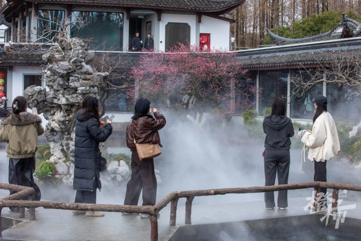 今天上午雨后初晴,虽然没有烟雨蒙蒙的自然氛围,但定点开启的人工雾森系统,也能为“梅景”增添几分仙气。雾气缭绕中,梅枝若隐若现,仿佛置身缥缈的仙境。