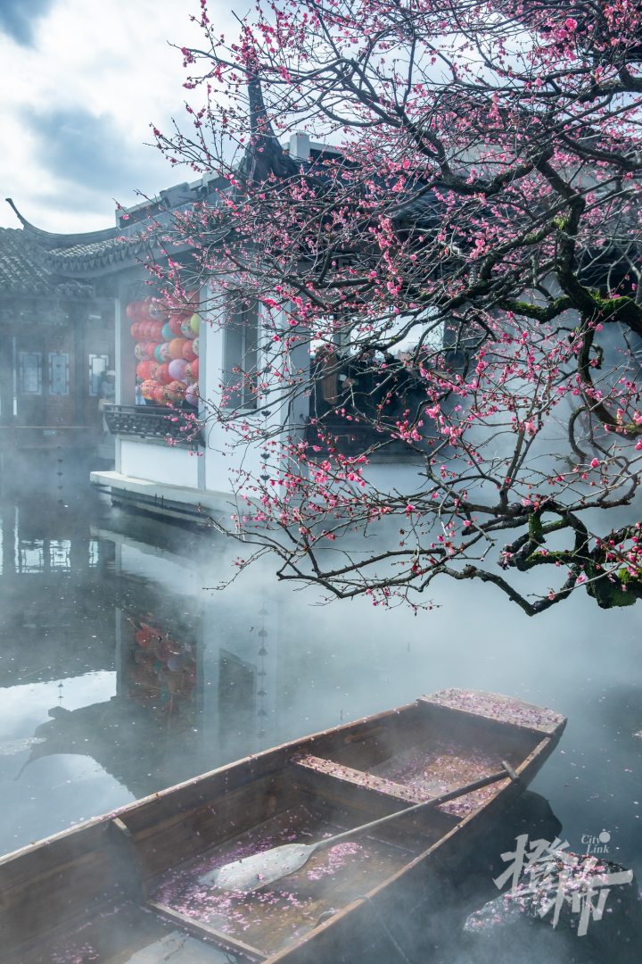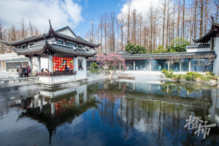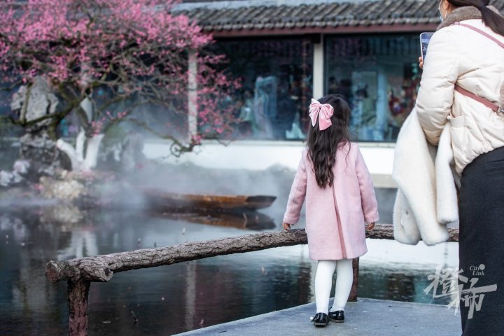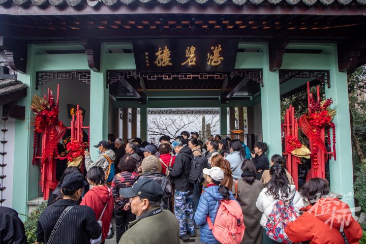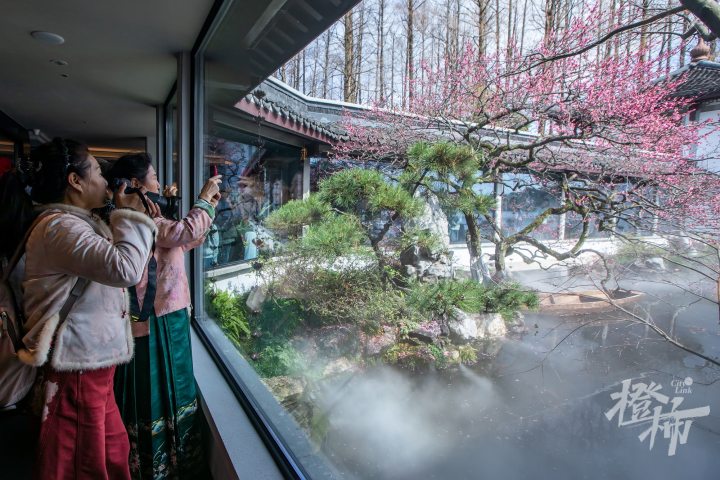 曲院风荷景区内的湛碧楼,是西湖边颇具诗意的赏梅胜地。一株红梅临水而立,白墙黛瓦,水雾升腾,宛如仙境画卷,随手一拍就是大片,不少网友直呼“太仙了”“这才是江南绝景”“中式审美的具象化了”。