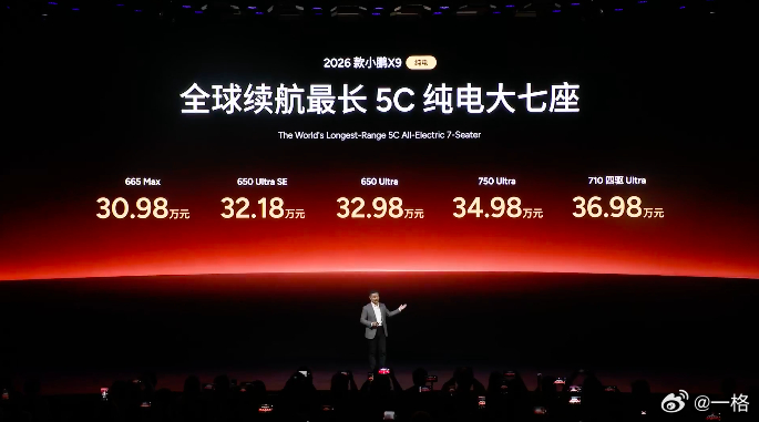 2026款小鹏X9纯电版上市了,全球续航最长5C纯电大七座,CLTC纯电续航最高750km,售价 30.98万元起。