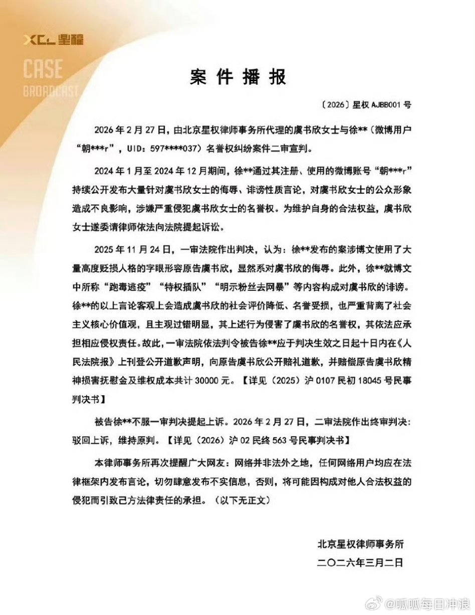 虞书欣最新维权进展:被告二审上诉失败,赔偿虞书欣3w并登报道歉!