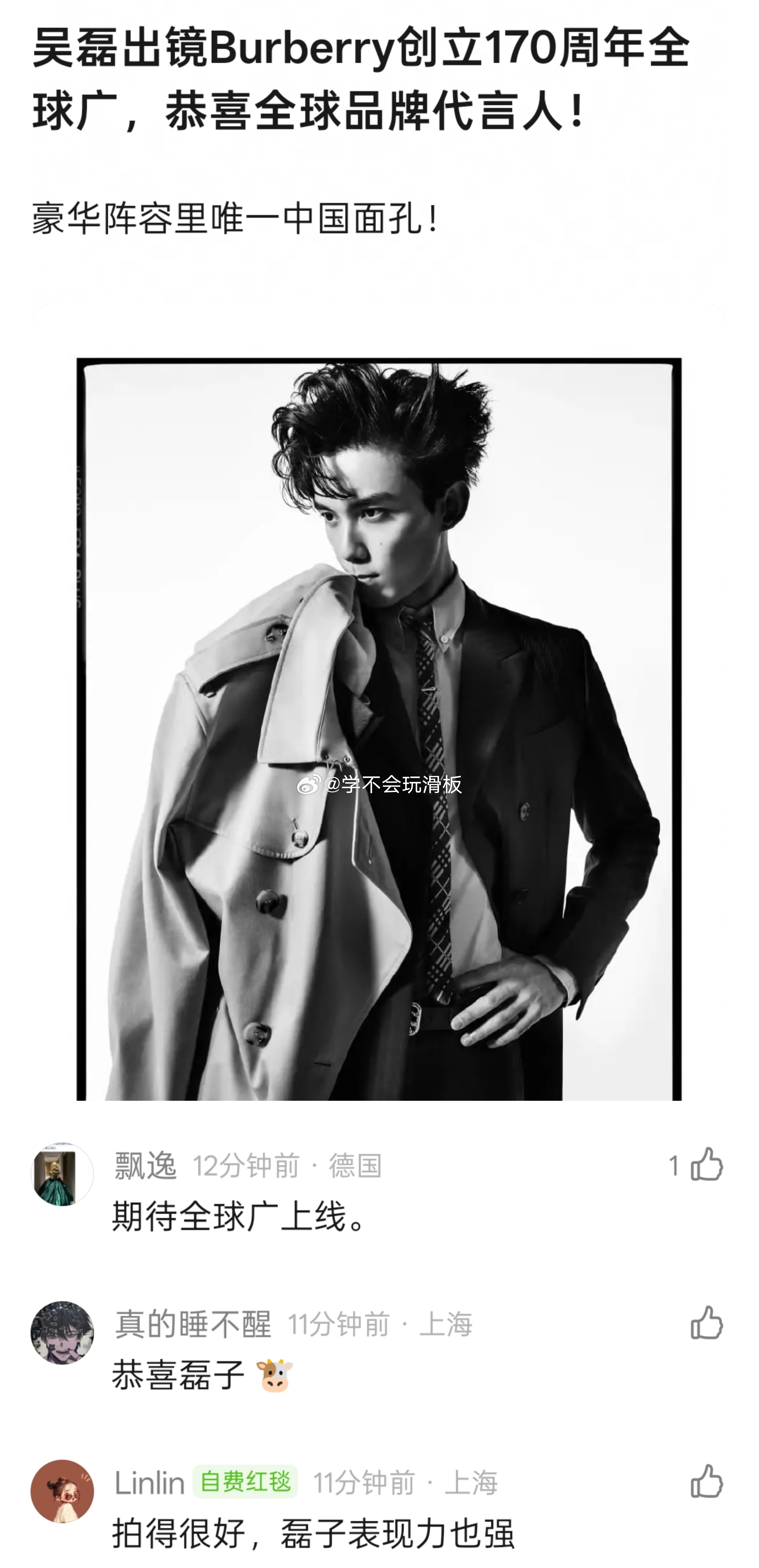 吴磊出镜巴宝莉创立170周年全球广,是豪华阵容里面,唯一一个国内面孔。