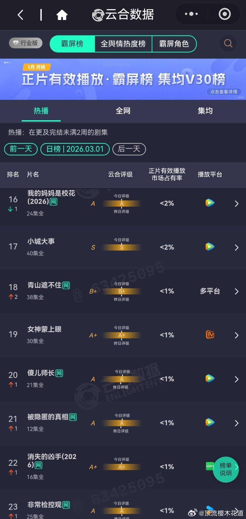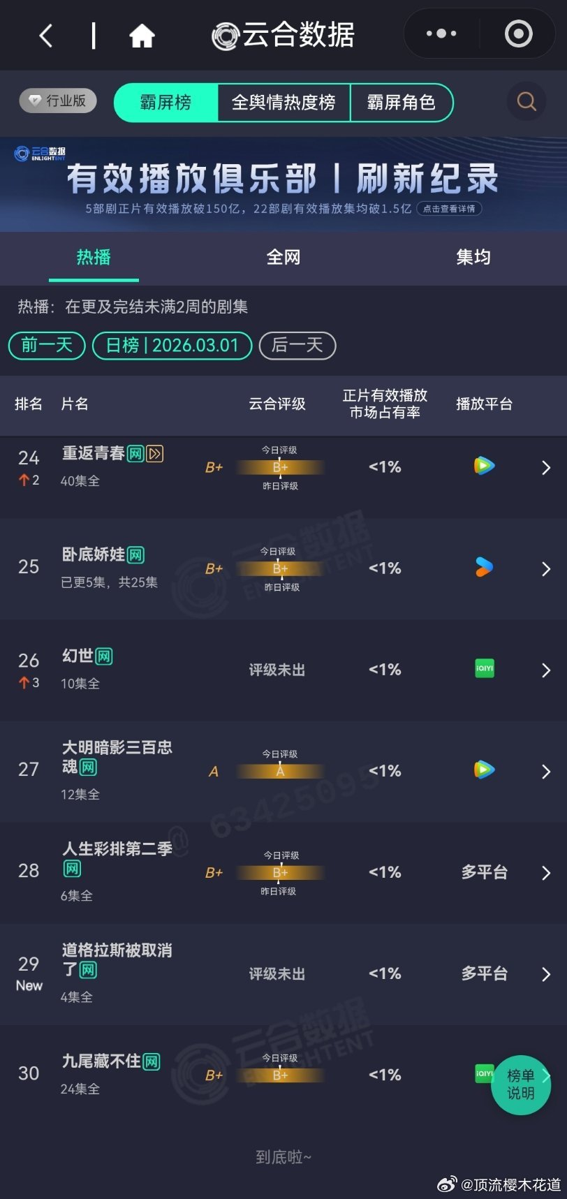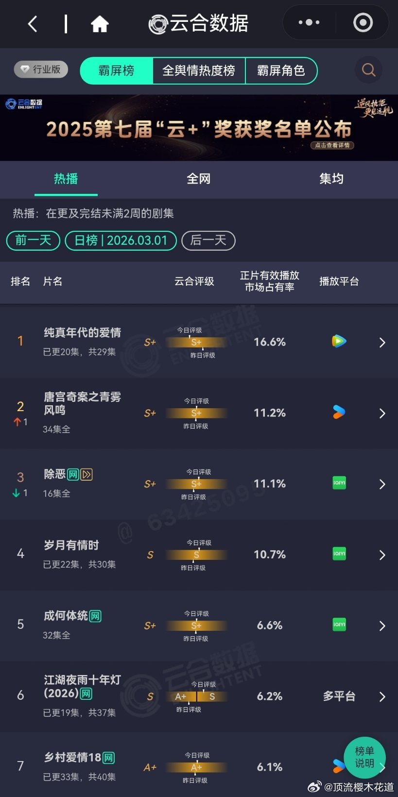 3月1日云合播放占比云合 VS酷云以后可能这种半斤八两的趋势是常态了,每年上新剧集太多,同类型剧集质量参差不齐,内容场景服化道同质化严重,观众兴趣点高度垂直,喜欢某个领域的一部分人还会继续深耕,追求品质的可能会尝新。