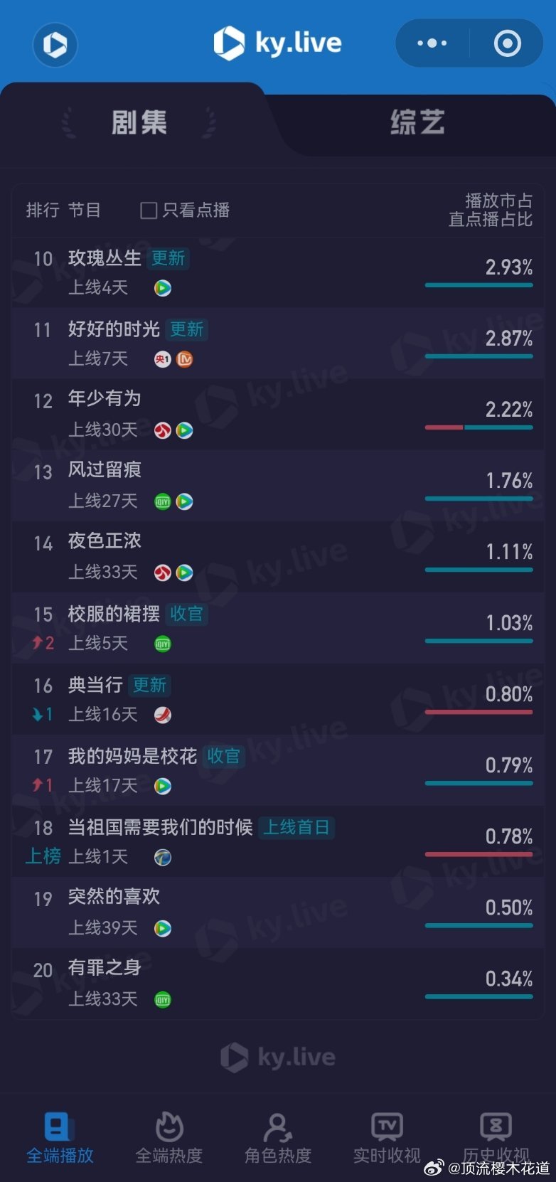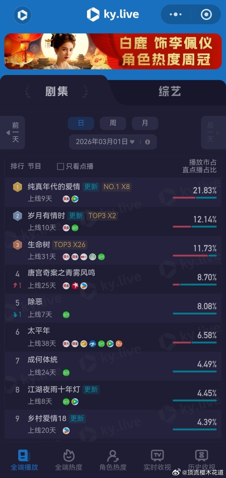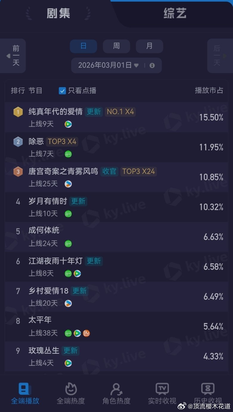 3月1日云合播放占比云合 VS酷云以后可能这种半斤八两的趋势是常态了,每年上新剧集太多,同类型剧集质量参差不齐,内容场景服化道同质化严重,观众兴趣点高度垂直,喜欢某个领域的一部分人还会继续深耕,追求品质的可能会尝新。