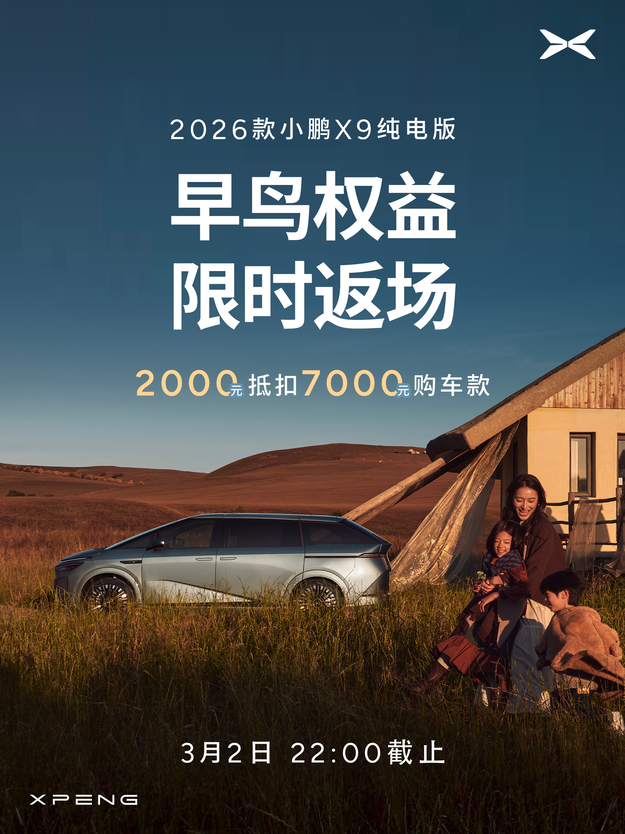 小鹏智驾负责人称拉开差距的时刻到了新款小鹏X9纯电版上市30.98万起30.98万元起,2026款小鹏X9纯电版重磅上市新车共推出5款版型,包括665 Max、650 Ultra SE、650 Ultra、750 Ultra以及710 四驱Ultra,官方指导售价分别为30.98万元、32.18万元、32.98万元、34.98万元、36.98万元2026款小鹏X9超级增程新增1602 Ultra SE版本,价格为32.18万元。即日起至2026年4月30日24点(含)前下定2026款小鹏X9纯电版,可享最高价值50,000元 权益限时送,包含三电终身质保、价值12,000元的座舱升级套装、至高价值30,000元金融/选装基金、至高价值15,000元置换权益以及每年1500度电卡(6年)的复购权益。2026款小鹏X9超级增程权益与2026款纯电版权益一致(2026年3月31日24:00前下定)此外24和25款的X9车主置换26款X9可以获得额外1万元的代金券补贴。(2025年11月20日已发放)还有早鸟权益限时返场,3月2日22点(含)前下定全车系,可享受2000元抵7000元购车款权益。
