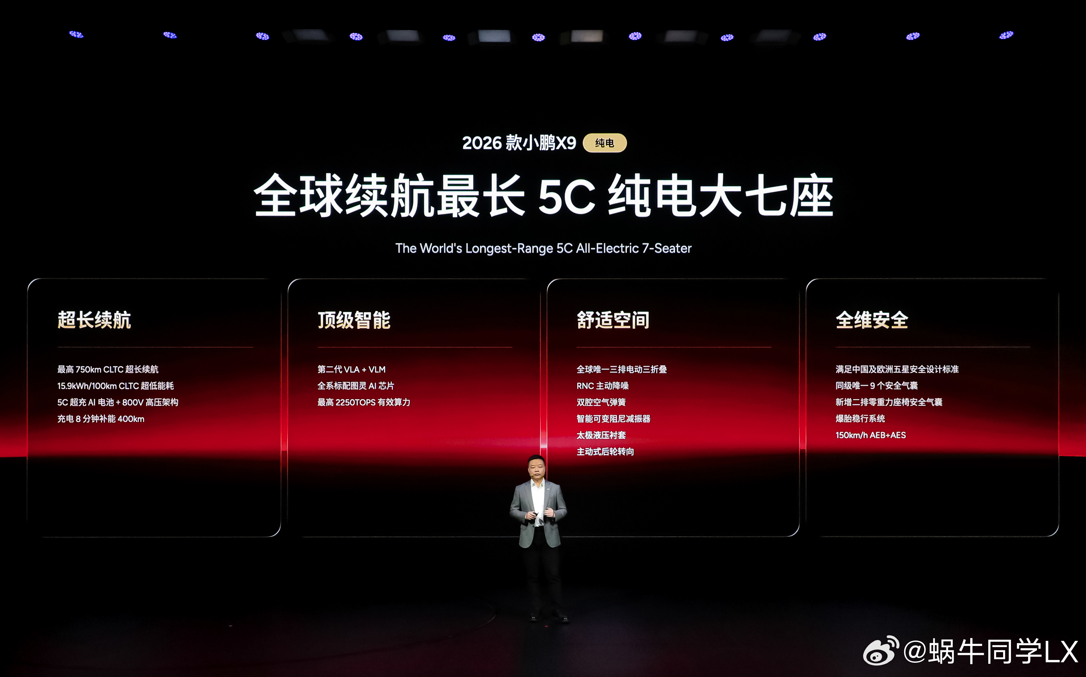 2026款小鹏X9是全球续航最长5C纯电七座,CLTC纯电续航最高750km,CLTC综合电耗同级领先低至15.9kwh/100km,全系标配800V+5C超充,10%-80%补能不到12分钟。另外,全系标配图灵 AI 芯片,最高有效算力达2250TOPS,搭载第二代VLA物理世界大模型。新车全球首发三排电动折叠,一车变四房;同级唯一带安全气囊的零重力座椅、同级唯一百万太极AI底盘。全系标配同级唯一全车9安全气囊、极端全场景爆胎稳行、高速避障稳行;同时满足中欧五星设计标准,构筑五星安全防护体系。
