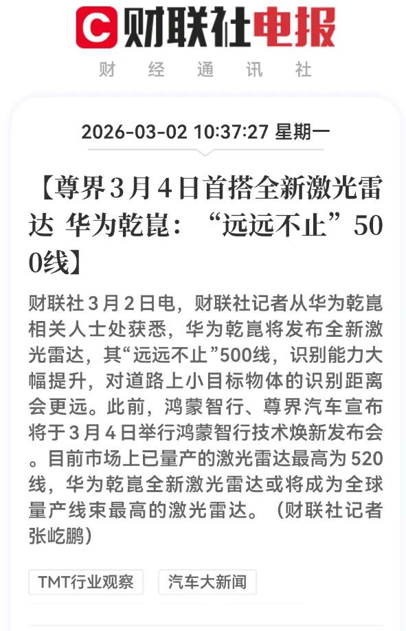 过去一年,尊界持续首发华为乾崑高阶智驾、智能底盘等核心技术,今日,再宣布尊界S800首发全球最高线束激光雷达。 在传统豪华品牌仍聚焦材质与声学时,尊界已将“感知安全冗余”作为新豪华内核。这一转变,正加速高端市场从“感官奢华”向“智能安心”迁移,重新划定竞争门槛。尊界首搭新激光雷达远远不止500线 尊界新激光雷达为全球量产最高线束新款尊界S800/问界M9 3月4日发布