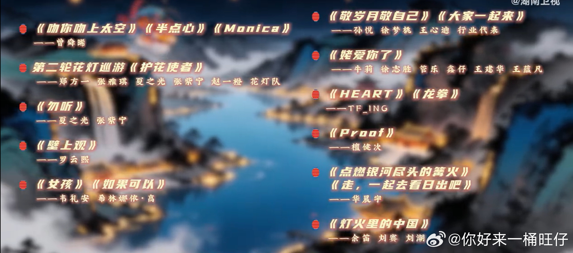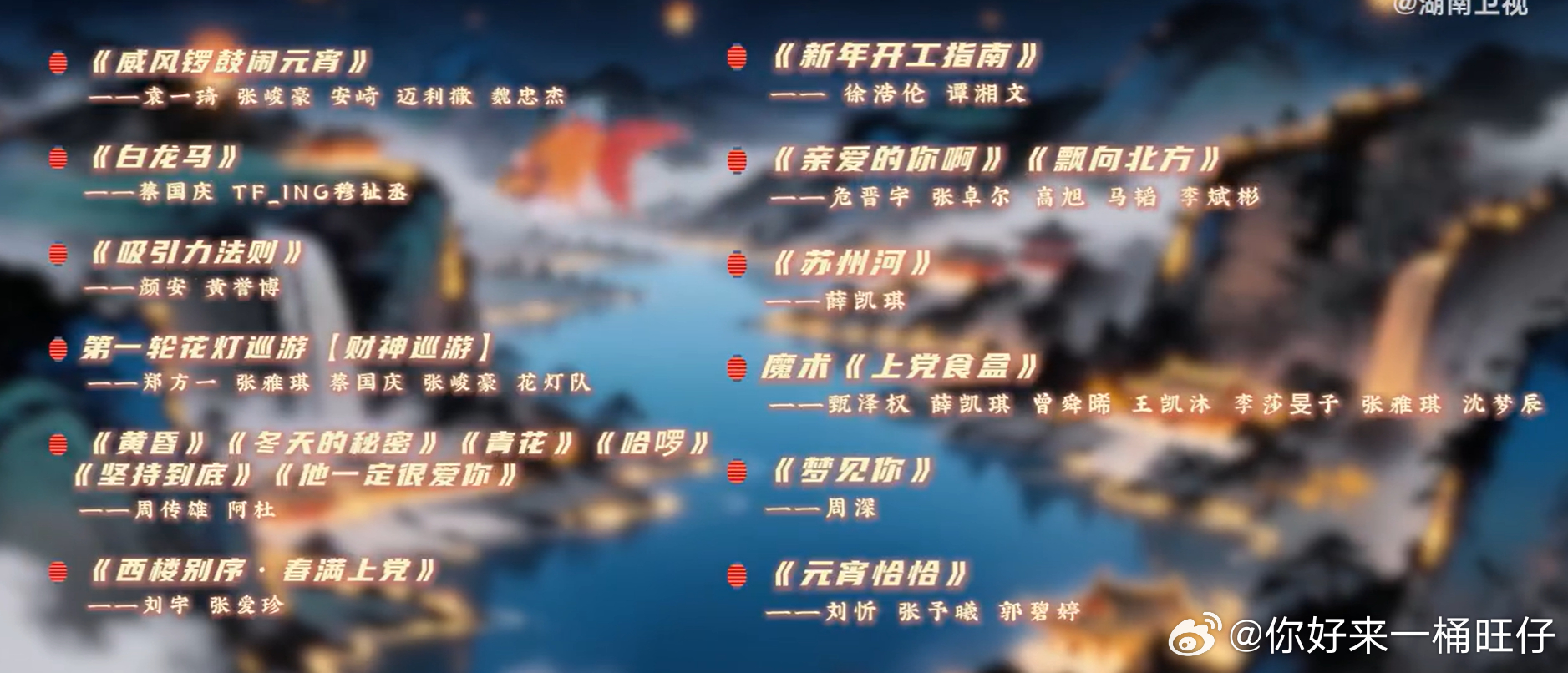 湖南卫视元宵喜乐会节目单湖南卫视元宵喜乐会湖南卫视元宵喜乐会节目单新鲜出炉啦ʕっ•ᴥ•ʔっ🏮蔡国庆、华晨宇、刘宇、罗云熙、TF_ING(童禹坤、邓佳鑫、穆祉丞、张子墨、黄朔)、檀健次、桃心夫妇(徐梦桃、王心迪)、周深、张峻豪,3月3日元宵节直播🎉期待(๑˃̵ᴗ˂̵)🏮