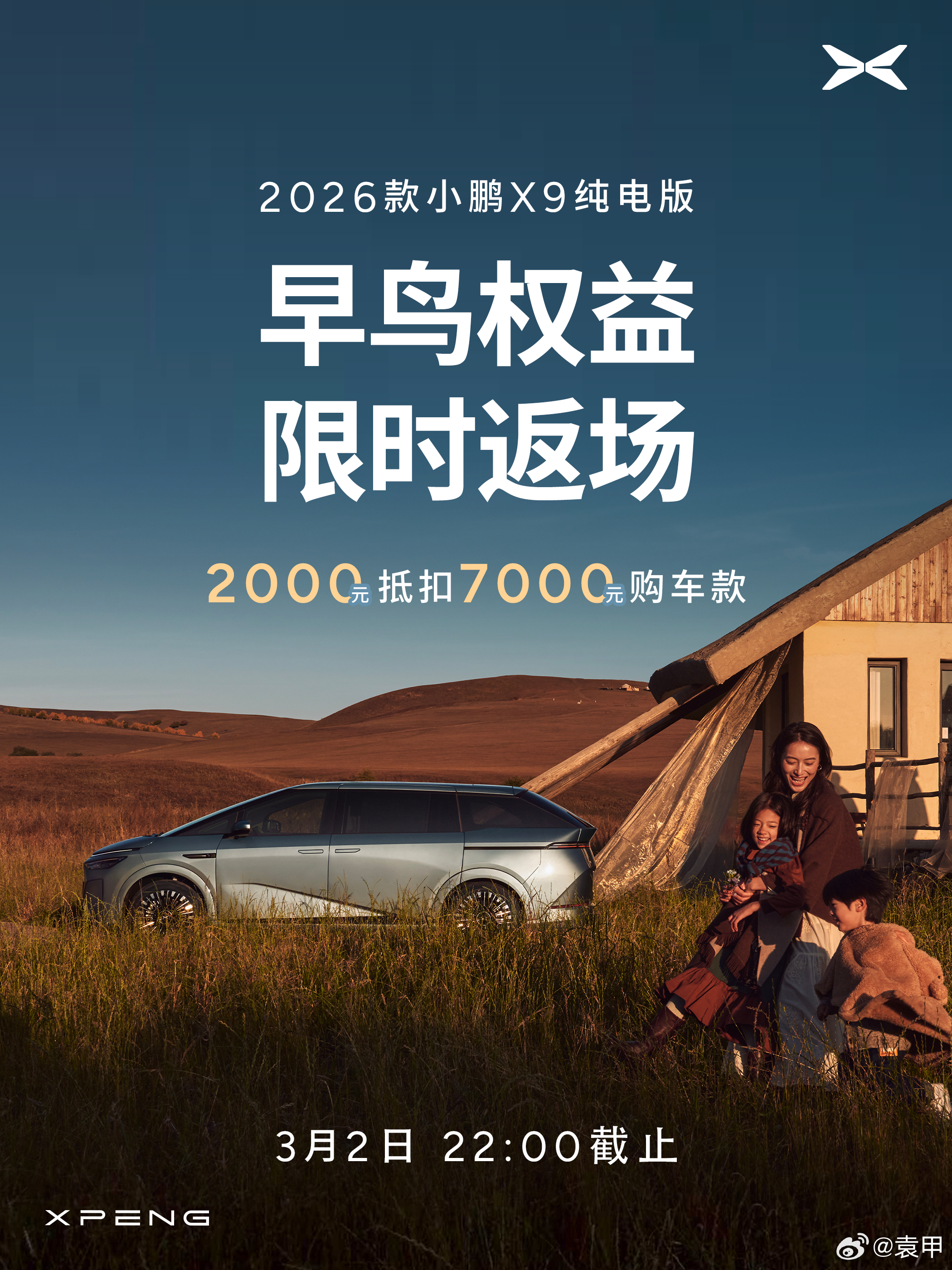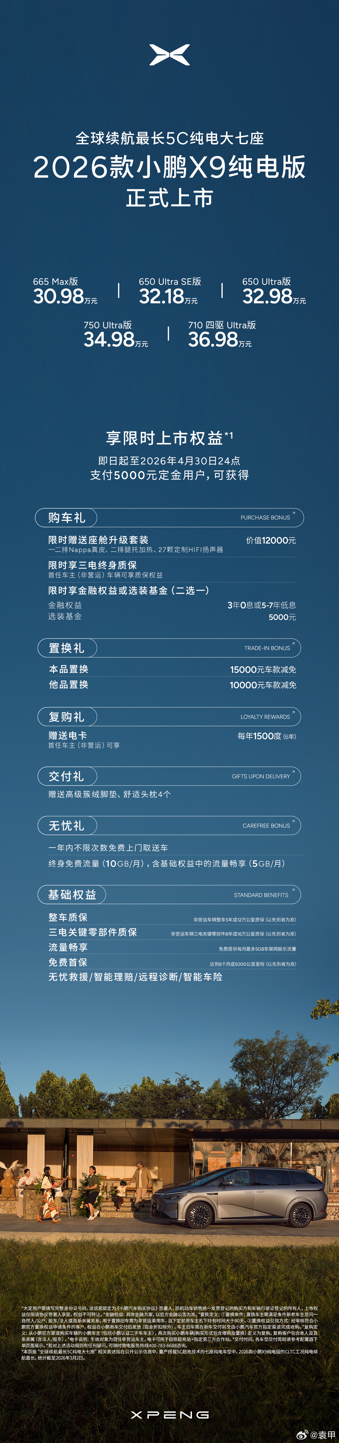 【2026款小鹏X9纯电版震撼上市!售价30.98万起!】新车共推出5款版型,包括665 Max、650 Ultra SE、650 Ultra、750 Ultra以及710 四驱Ultra,官方指导售价分别为30.98万元、32.18万元、32.98万元、34.98万元、36.98万元;2026款小鹏X9超级增程新增1602 Ultra SE版本,价格为32.18万元。即日起至2026年4月30日24点(含)前下定2026款小鹏X9纯电版,可享最高价值50,000元 权益限时送,包含三电终身质保、价值12,000元的座舱升级套装、至高价值30,000元金融/选装基金、至高价值15,000元置换权益以及每年1500度电卡(6年)的复购权益。2026款小鹏X9超级增程权益与2026款纯电版权益一致(2026年3月31日24:00前下定)此外24和25款的X9车主置换26款X9可以获得额外1万元的代金券补贴。(2025年11月20日已发放)还有早鸟权益限时返场,3月2日22点(含)前下定全车系,可享受2000元抵7000元购车款权益。2026款小鹏X9,两种动力,同一个旗舰标准,作为小鹏汽车的科技旗舰,希望以更全能的产品力,带给大家庭更舒适、更越级的产品体验!