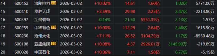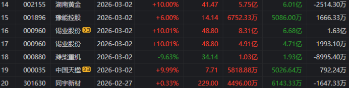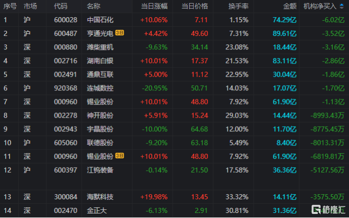 龙虎榜中涉及机构专用席位的个股中,单日净卖出额前三为中国石化、潍柴重机、湖南白银,分别为6.02亿、3.16亿、2.86亿。