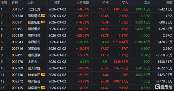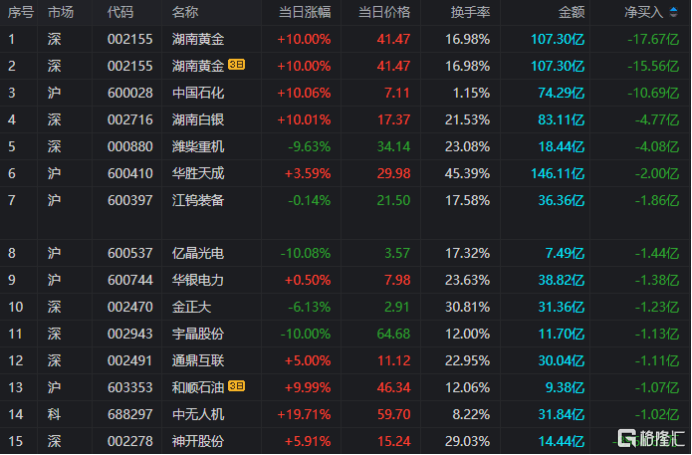 龙虎榜单日净卖出额前三为湖南黄金、中国石化、湖南白银,分别为17.67亿、10.69亿、4.77亿。