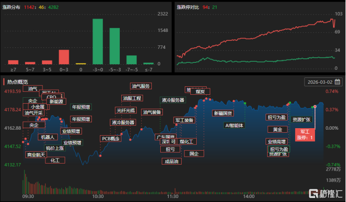 3月2日,A股三大指数涨跌不一,截至收盘,沪指涨0.47%报4182点,深证成指跌0.2%,创业板指跌0.49%。