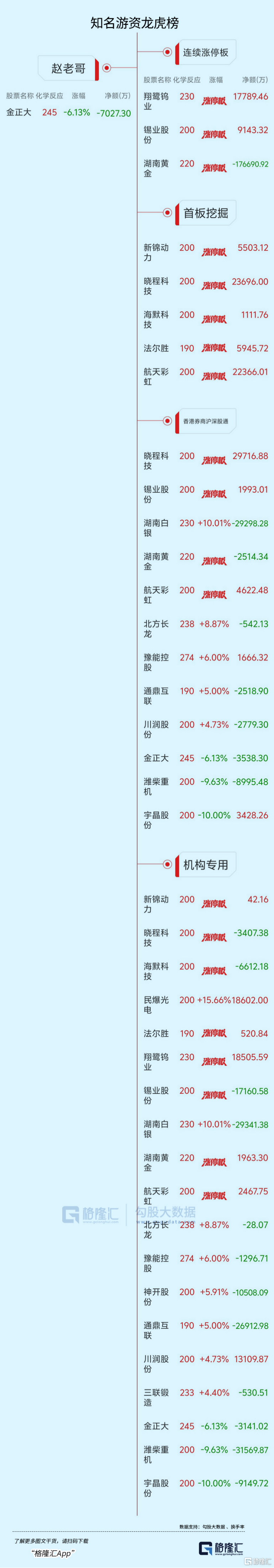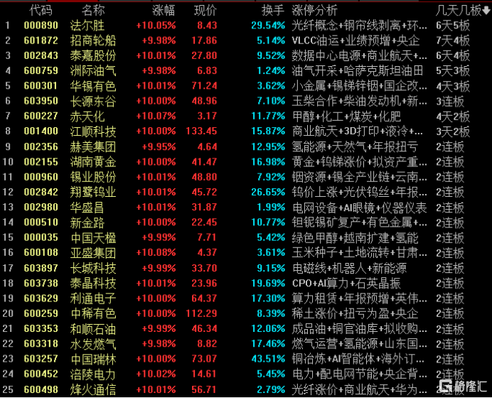 法尔胜6天5板,招商轮船7天4板,泰嘉股份6天4板,洲际油气5天3板,华锡有色4天3板,长源东谷3连板,赤天化4天2板,江顺科技3天2板,赫美集团、湖南黄金、锡业股份、翔鹭钨业、华盛昌、新金路、中国天楹、亚盛集团、长城科技、泰晶科技、利通电子、中稀有色、和顺石油、水发燃气、中国瑞林、涪陵电力、烽火通信2连板。