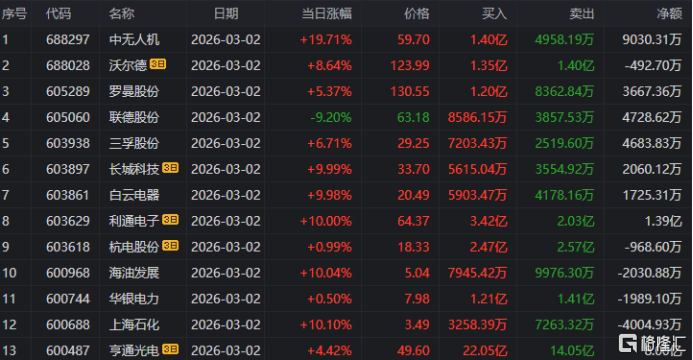 在龙虎榜中,涉及沪股通专用席位的个股有12只,中无人机的净买入额最大,9030.31万元。