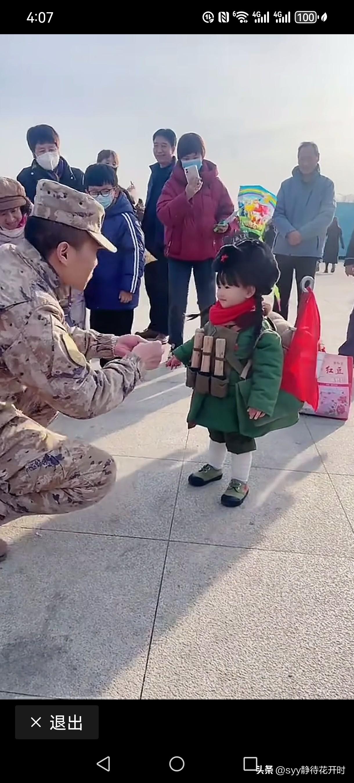 竟然被一个穿军装的小萌娃,感动到了!视频中的她,只有三四岁的样子。头戴五角星的棉军帽,身穿绿色带红领章的棉军服。 这不爱红妆,爱武装的小女娃,在这套军装的映衬下,显得格外的威风!有了这身行头,还不算完,她最抓人眼球的装备还在后头呢! 只见小小的她,在腰间的皮带上,挂了一排手榴弹;在背上背了一个行军包。不但如此,她还在行军包上,别了一把带红飘带的大砍刀。 装备齐了,细节上也不能马虎。只见小女娃的小短腿上,不但打满了挷腿。脚上还穿了一双,解放牌的小胶鞋。 别看人家的年龄小,但她那雄赳赳气昂昂的老兵气势,直接把旁边看热闹的,一众成年人的形象给秒杀了!就这超强的前辈范,就连给他喂糖的军人叔叔,论知排辈也得甘拜下风啊! 记得有个九岁男孩,曾经说了这样一段话:“当兵的职责是什么?不就是保卫边疆,守卫国家领土完整,保护百姓的安全吗?” 一个年仅九岁的孩子,他的认知和格局竟然能高到如此的地步,真是语出惊人孺子可教啊!少年强,则国强!“爱国情怀”,从娃娃抓起! “爱国”,从来不是纸上谈兵的空话!它更是,每一个有良知的公民,义不容辞的责任和义务!祖国的荣誉,神圣不可侵犯,犯我中华者,虽远必诛!