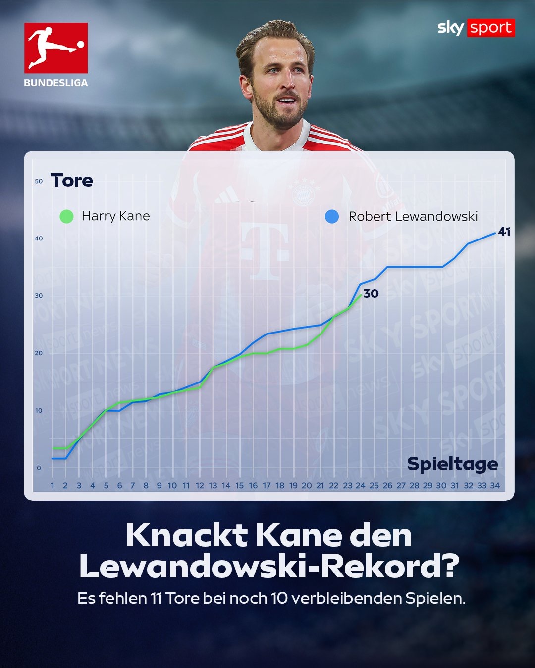 目前德甲本赛季还剩10场比赛,凯恩距离莱万单赛季41球的德甲纪录还有11球,很有机会创造新的纪录。