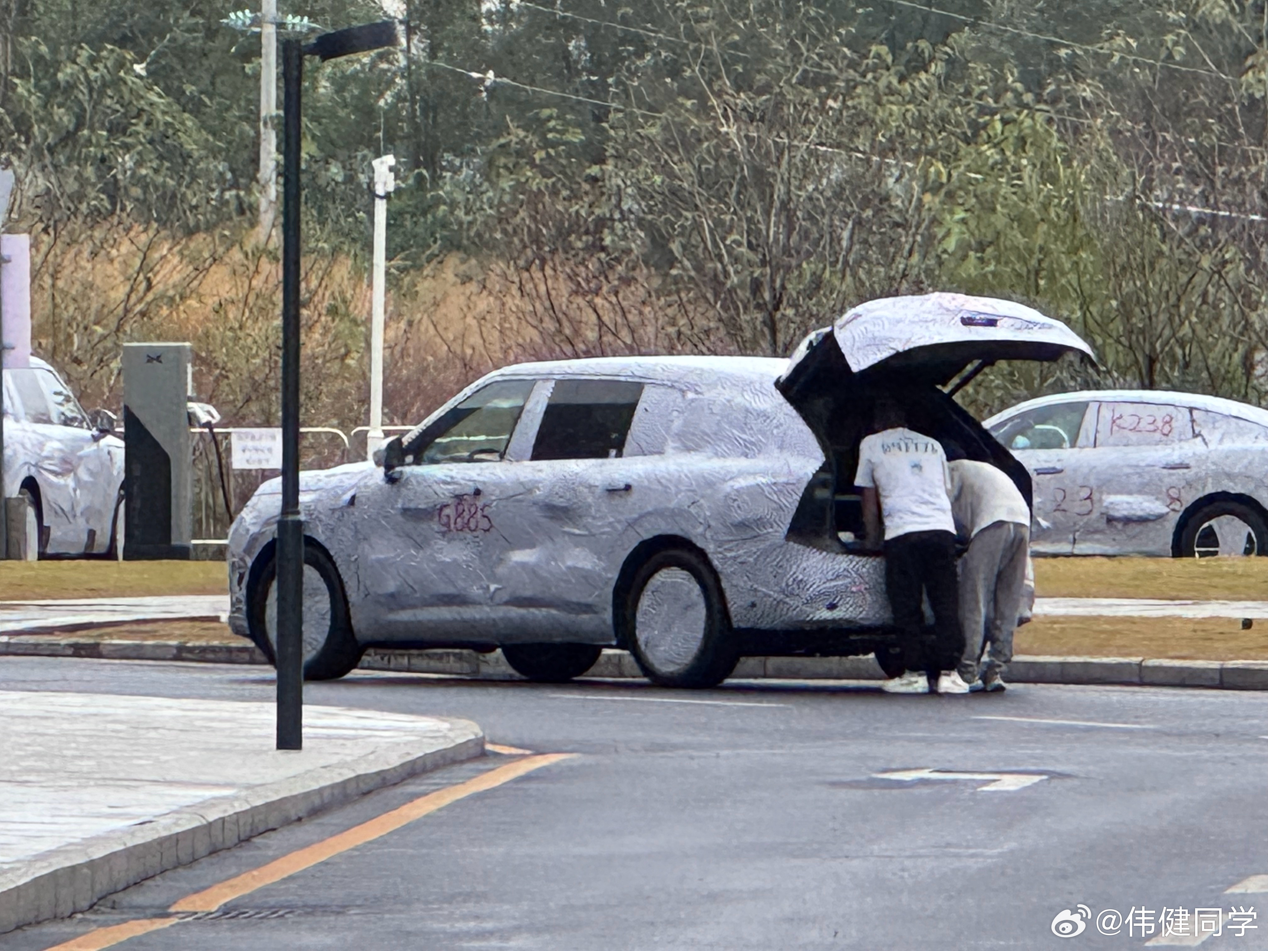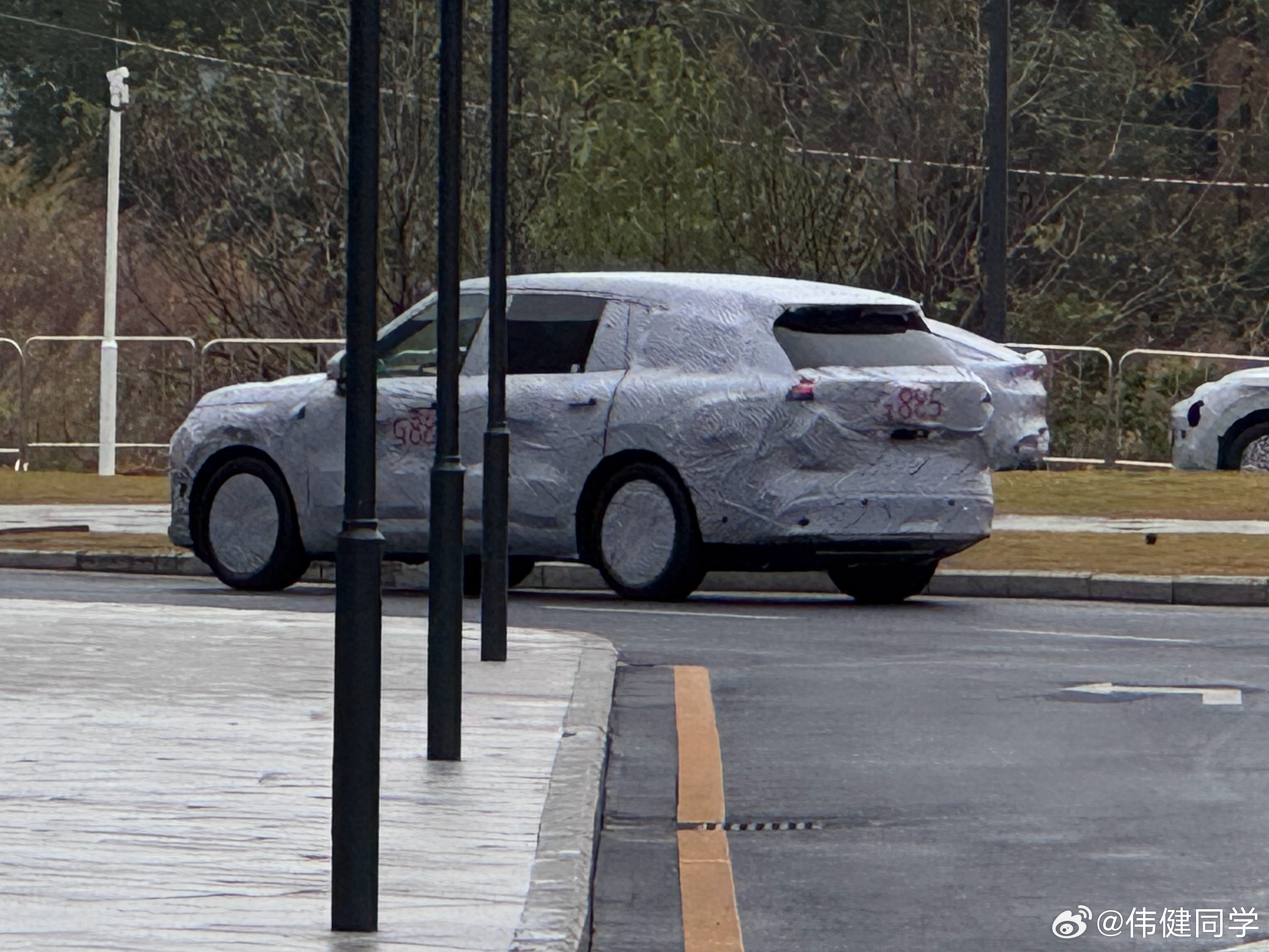 小鹏G02最新谍照,第一张常规视角的尾部谍照,车顶压得挺狠啊,细节与之前的判断还是有不少差别,但是小GX肯定没跑,一套设计。图源