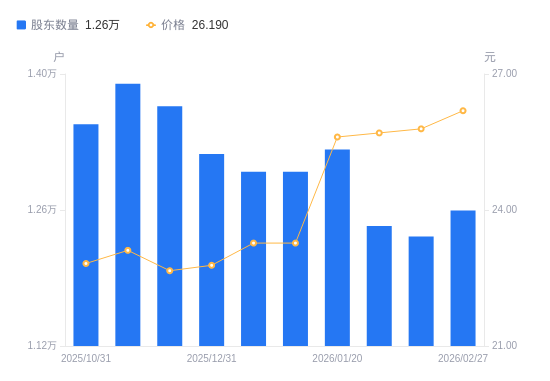 日期A股户数(户)流通A股户均持股数(股)户均持股市值(万元)2026-02-27125957376.5119.322026-02-10123287536.2719.442026-01-30124367470.8219.202026-01-20132237026.1817.992026-01-10129957149.4616.642026-01-09129957149.4616.642025-12-31131777050.7116.062025-11-28136686797.4215.402025-11-20139006683.9715.452025-10-31134846890.1815.72