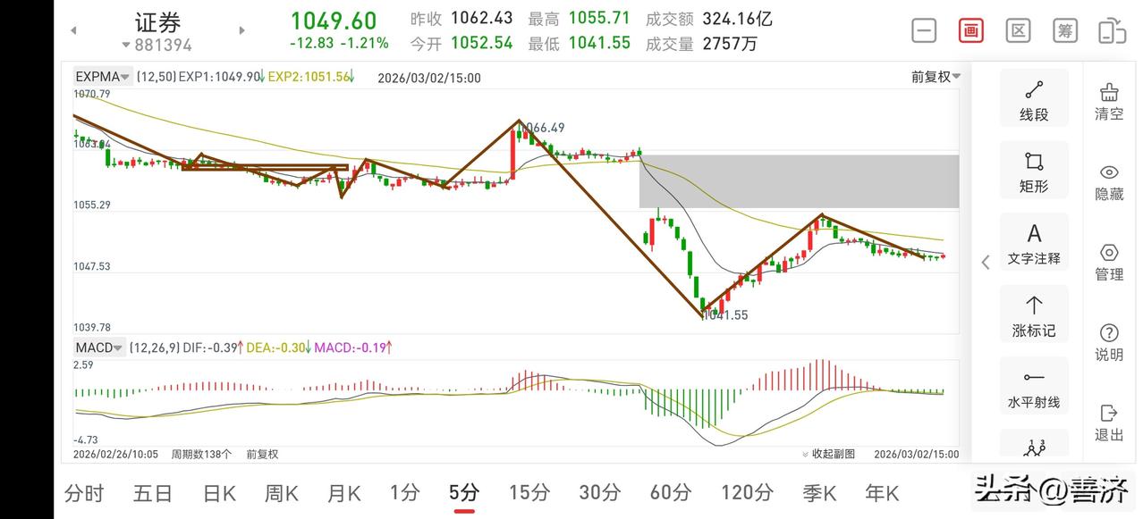 证券板块复盘(2026.3.2) 今天下午证券板块走势还算可以,它的回调很弱,这也意味着明天是有短线操作机会的,但日线一笔调整还没有结束,所以明天只看反弹,反弹过后后面还是有可能再破新低的,当然这是后面几天的事了,操作上做好应对就可以了。 1.从30分钟图一上看,明天会反弹30分钟一笔,大概率会回补上方缺口,从而构建第三个30分钟中枢,由第三个中枢逐步演化从构建日线三卖的过程,当然这个过程非一日就能完成的,如果你想在此处做高抛低吸,需要按5分钟级别去应对。 2.从5分钟图二上看,下午的一笔回踩很弱,那么明天大概率会向上反弹去回补上方缺口,待缺口回补完成后,还会向下回踩30分钟一笔,所以明天你想做差价,开盘即可考虑回补三成仓位,待缺口回补完成后,再把三成仓位退出来,在做差价时,不要去追求极限操作,只要产生差价,就要考虑退出的问题了。因为还在日线一笔的回调中,还是有比较大的可能后面还会再破新低的。 总之,日线一笔调整并没有结束,耐心等吧!新年爱好打卡 证券板块解析 你认为炒股真正的关键是什么?