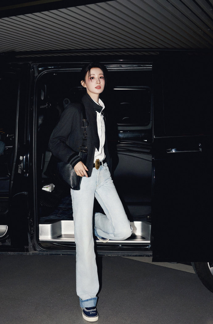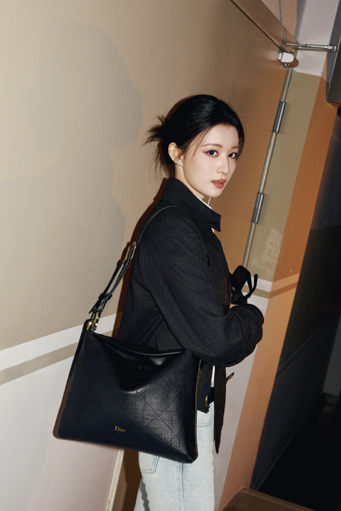 王楚然黑色短款上衣搭配浅蓝牛仔,肩背经典托特包,清冷又干练,刚柔并济的气质完美演绎现代女性的优雅力量,每一帧都是DIOR画报感。