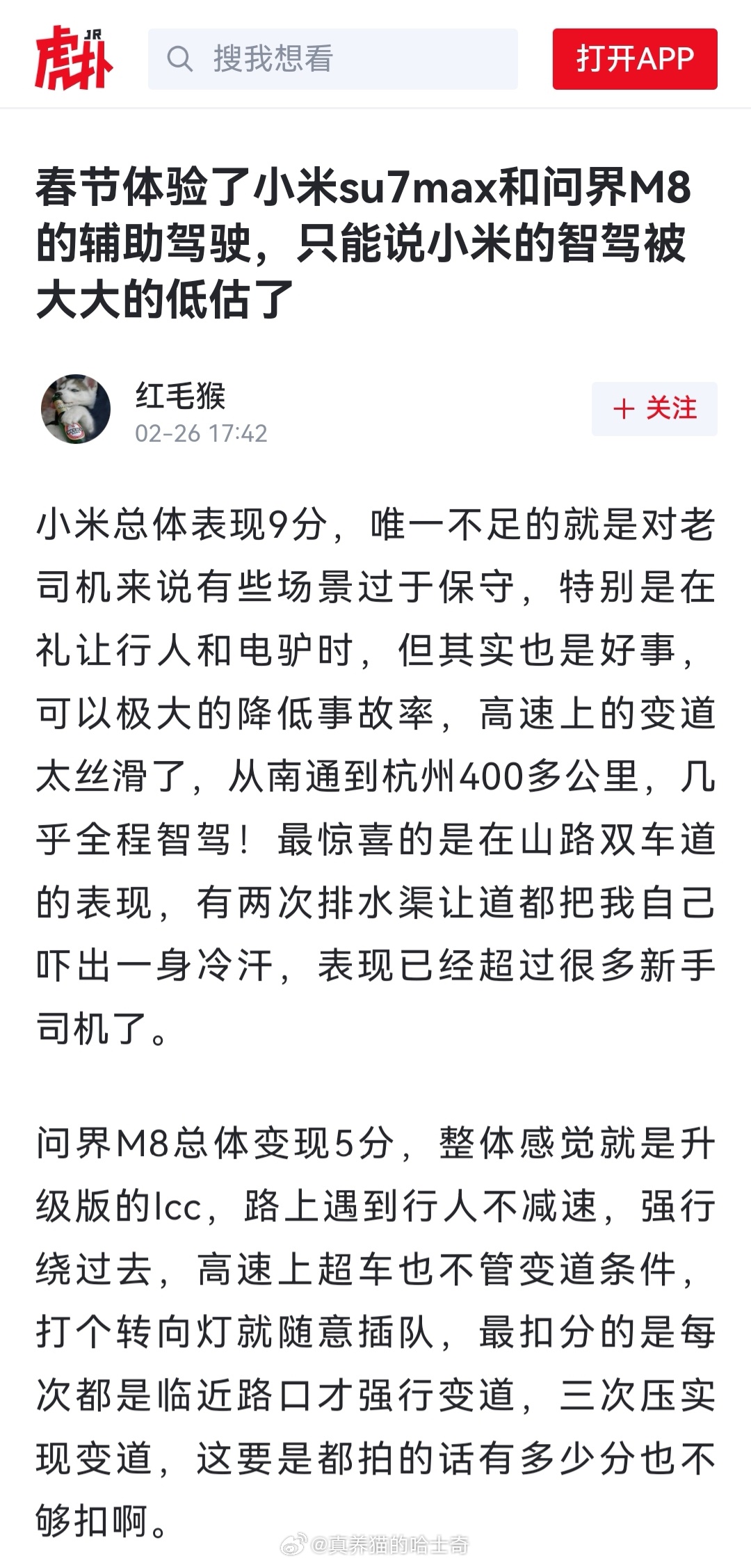 虎扑网友:春节体验了小米su7max和问界M8的辅助驾驶,小米总体表现9分,问界