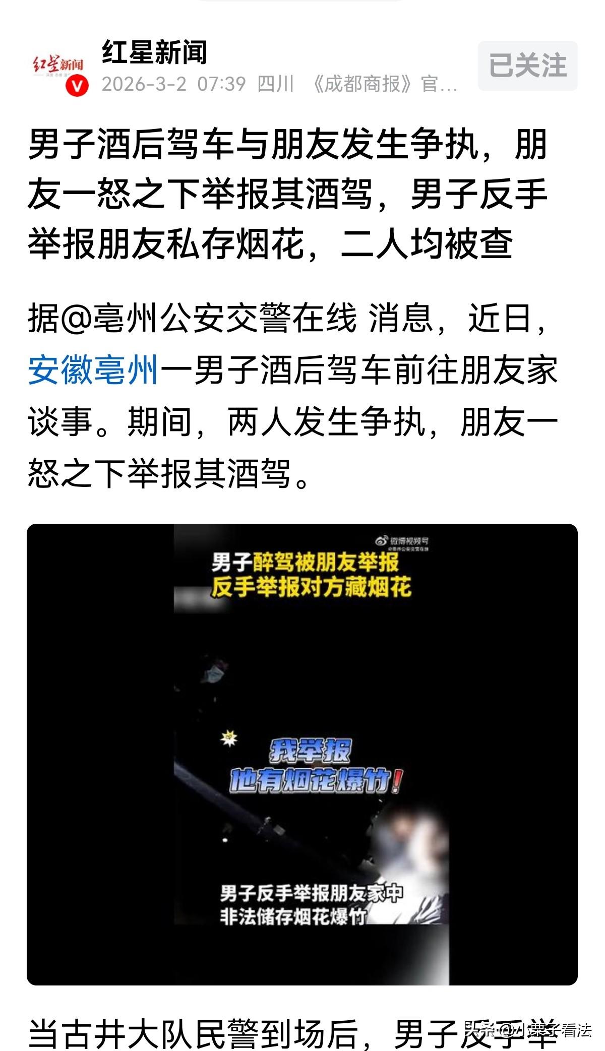“物以类聚!”安徽亳州,男子酒足饭饱后开车去朋友家谈事,谁知两人一言不合发生争执,朋友一气之下报警举报其酒驾。民警处理期间,男子反手举报朋友家中非法存放烟花爆竹。经检测,男子血液酒精含量为每100ml188.5mg,属于醉驾,已涉嫌危险驾驶罪,将被吊销驾驶证并面临刑事处罚。其朋友也因非法储存危险物品被警方立。网友:不愧是好友,有福同享,有难同当! 最近发生了一件特别离谱又特别解气的事,堪称现实版“塑料兄弟情”教科书。 曹某当天酒足饭饱后,突然想起与朋友之间有点事,想去找他问问。 他喝了酒本是不能开车的,可他一想路程又不远,哪能那么巧就被查了呢?于是,抱着侥幸心理直接开车就去了朋友家。 两人一见面,刚开始聊的还挺好,可没一会就话不投机,吵了起来。 俩人越吵越凶,情绪一上来谁也不让谁。 曹某的朋友当时也是气昏了头,没控制住情绪,直接直接掏出手机打110,实名举报曹某酒驾。 他大概觉得,这一招能狠狠拿捏曹某,让对方低头认错,却没想到,这一举报,直接把俩人都送进了警方的调查范围。 民警到现场后,一眼就看出曹某不对劲,走路打晃、满嘴酒气,简单询问几句,曹某也没法抵赖,老老实实承认自己喝了酒开车。 这时候的曹某,心里又慌又气,慌的是酒驾被抓现行,肯定要受重罚;气的是朋友一点情面都不讲,为了点争执就把自己往火坑里推。 越想越不服气的曹某,当场就来了个“绝地反击”,对着民警直言:他举报我,我也举报他!他家里面非法放了烟花爆竹,你们去查! 那语气,满是赌气和报复,完全没考虑过后果,只想着你不让我好过,我也不让你舒坦。 民警本着严谨执法的原则,顺着曹某的举报去核查,果然在朋友家里查获了非法储存的烟花爆竹。 这些烟花没有正规储存手续,放在居民家里就是定时炸弹,一旦遇到明火或者高温,极易引发爆炸火灾,威胁自己和邻居的生命财产安全。 《治安管理处罚法》第30条:违反国家规定,……处置爆炸性、毒害性、放射性、腐蚀性物质或者传染病病原体等危险物质的,情节较轻的,处5日以上10日以下拘留。 这边曹某的血液检测结果也出来了,每100毫升血液酒精含量高达188.5毫克,远超80毫克的醉驾标准,属于严重醉酒驾驶,已经涉嫌危险驾驶罪。 《刑法》第133条(二)醉酒驾驶机动车的。处拘役,并处罚金。 曹某的行为已构成危险驾驶罪,将被吊销驾驶证,五年内不得重新取得,同时面临拘役并处罚金的刑事处罚。 烟花爆竹属于法定爆炸性危险物质,未经许可私自储存,违反国家安全管理规定,侵害公共安全。 曹某朋友的行为已构成非法储存危险物质,公安机关可依法给予行政拘留处罚,涉案烟花爆竹一律收缴。 事情发展到这,结局早已注定,俩人都为自己的违法行为和冲动脾气付出了代价。 曹某作为醉驾者,不仅会被吊销驾驶证,五年内不能重新考取,还要面临拘役和罚金的刑事处罚,留下案底,往后工作、生活都会受影响。 他的朋友,以为举报别人能解气,结果自己非法储存危险物品的违法行为也暴露了,被警方立案调查,等待他的是行政拘留、罚款以及烟花爆竹被全部收缴的处罚。 有人说,正儿八经的狐朋狗友!也不知对他俩谁的伤害更大? 有人说,这朋友够哥们!为了相互的安全互相揭露不安全的行为,虽要受到法律的制裁但保住了更多人的人身安全。 还有人说,这就好比老郭相声里的互相喂屎!简直糟蹋了“朋友”这个词! 一场朋友间的小争执,最后变成了两败俱伤的闹剧,实在让人哭笑不得。 对于他俩的行为,您怎么看?