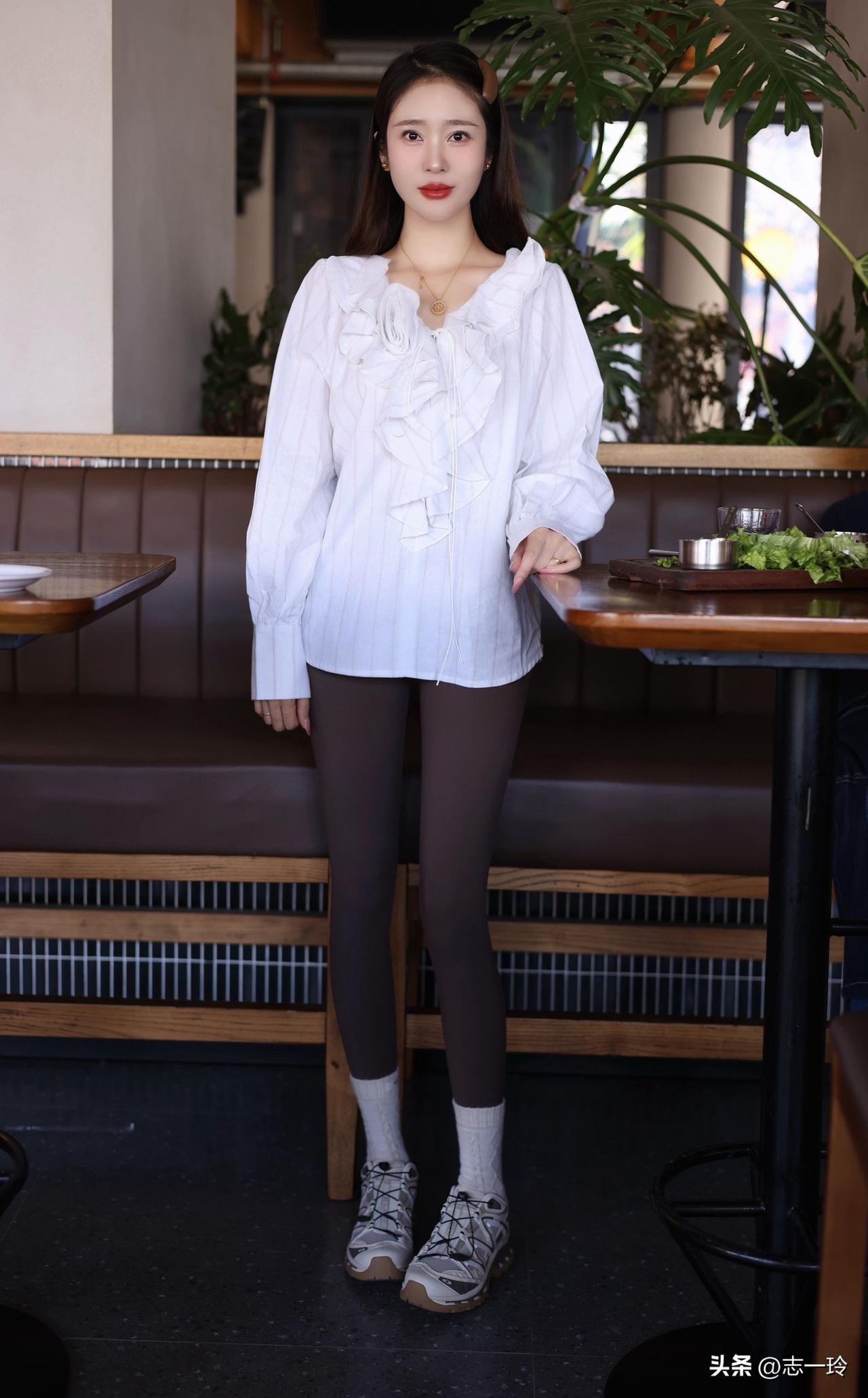 简约风穿搭,白色衬衫搭配黑色紧身裤,清新自然。