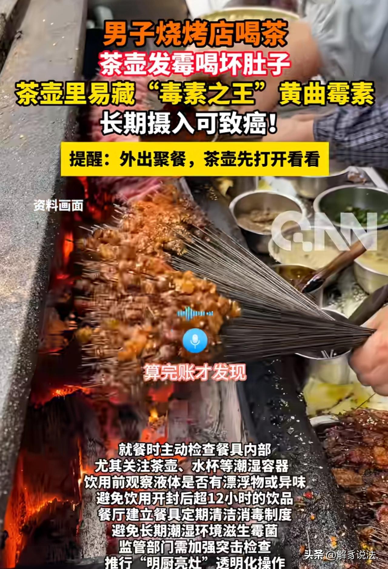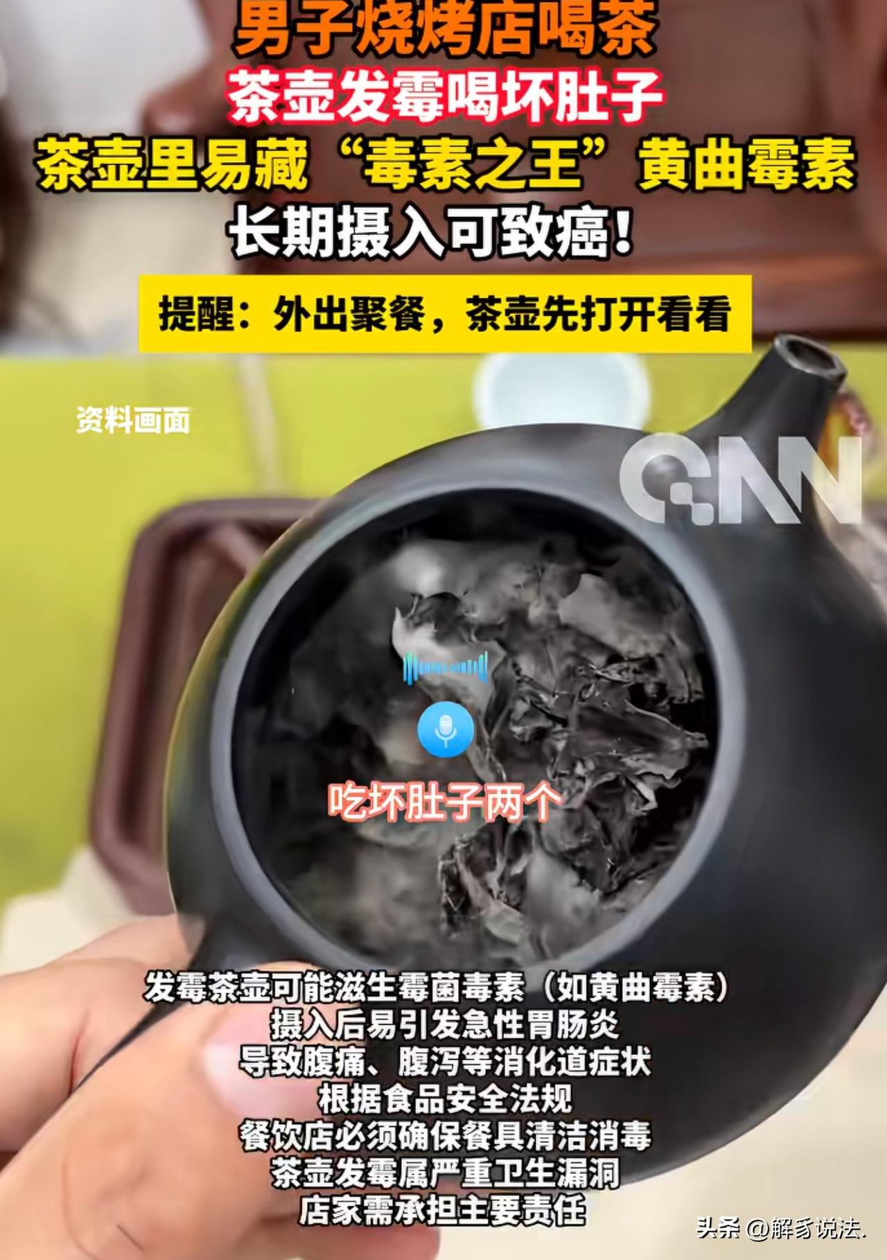 “恶心到家了!”吉林通化,男子和两个朋友来到一家烧烤店撸串。落座后,服务员先给他们上了一壶茶水,谁知,饭局结束后,男子无意打开茶壶盖看了一眼,这一看差点没惊掉下巴,只见茶壶盖内已经发霉,三人看后头皮发麻,直犯呕。随后,就有两人先后出现腹泻的情况。男子赶紧找到店员讨要说法时,店员却说:老板在韩国打工,这事不归我管!男子怒火直冲天灵盖,接下来这样做了…… 事发当天,龙先生约了两个个朋友,一起到一家烧烤店聚餐。 大家一路上说说笑笑,心情都很不错,想着能好好吃顿饭、放松一下,谁也没想到,这顿原本开心的聚餐,最后会变成一件又恶心又生气的糟心事。 进店坐下后,服务员很快端来茶壶,给大家倒上茶水。 三人个人一边喝茶,一边聊天,店里飘着烤肉的香味,都在等着烤串上桌。 没过多久,热气腾腾的烤串就端了上来,肉串烤得油光发亮,香气十足。 大家拿起烤串,边吃边喝边聊,气氛很热闹,全程都没发现有什么不对劲。 吃饱喝足,几人算结完账,刚准备离开。 龙先生随手拿起桌上的茶壶,想把盖子盖好,无意间掀开一看,当场就被吓住了。 茶壶里面长满了大片黑绿色的霉斑,一层叠一层,又厚又脏,明显是长期不清洗、不消毒才长出来的。 看到这一幕,龙先生胃里立刻翻江倒海,特别恶心。朋友们过来一看,也都脸色发白,忍不住捂住嘴。 他们这才反应过来,刚才喝的茶水,全是用这个发霉的茶壶泡的,一整壶带霉菌的水,全都被大家喝进了肚子里。 没过多久,龙先生和朋友就开始肚子疼、拉肚子。 身体不舒服,心里又憋屈,几人立刻去找店员,希望对方能给个说法,至少道个歉、解决问题。 可店员的态度十分冷漠,不仅没有一点歉意,还直接推卸责任,说老板在韩国打工,自己管不了店里的事,有问题也找不到人负责。 三人一听,气不打一出来,这名显就是不负责任的态度,让他们自认倒霉。 几人憋了一肚子气,好好的聚餐,不仅没吃开心,还遭了罪、受了气。 为了给自己和朋友讨回公道,龙先生当场拨打了12345投诉电话,坚决要讨个说法。 《食品安全法》第148条规定:消费者因不符合食品安全标准的食品受到损害的,可以向经营者要求赔偿损失,还可以主张价款十倍或者损失三倍的赔偿金;增加赔偿的金额不足一千元的,按一千元计算。 同时,根据《食品安全法》相关规定,餐饮具属于食品相关产品,发霉、污秽不洁的餐具严禁使用。 这家烧烤店提供严重发霉的茶壶,导致顾客饮用后腹泻,已经违反食品安全规定,不仅要承担民事赔偿,还可能面临市场监管部门的行政处罚。
