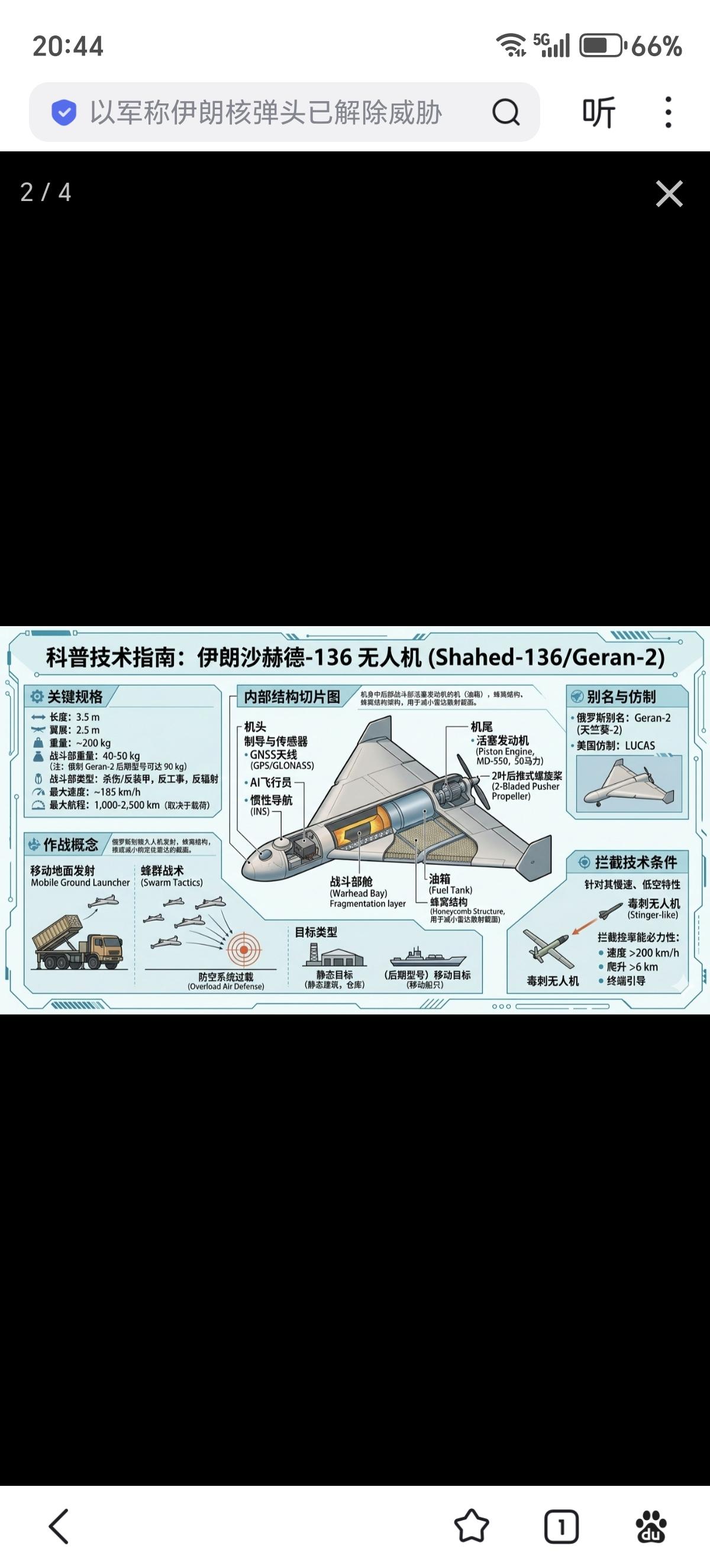 沙赫德-136”是伊朗开发的一款经典单向攻击无人机,由伊朗沙赫德航空工业公司(HESA)设计制造。它以极低的成本、超远航程和饱和攻击能力闻名。 它采用三角翼布局,外形简洁,像一个带尾推的大号模型飞机,噪音很大(摩托车引擎般的轰鸣),在几公里外就能听到。 单价只有巡航导弹的1/50–1/100(2~5万美元),却能攻击同样距离的目标,导致“攻防极不对称”。 乌克兰用几百万美元的导弹/防空弹拦截,伊朗/俄罗斯用几万美元的无人机饱和投放,性价比碾压。 通常5–6架一组从卡车发射架(类似集装箱)火箭助推起飞,成群低空突防,迫使对手防空系统过载。即使70–90%被拦截,剩下的仍能造成重大破坏。 弱点很明显,速度慢(185 km/h),雷达反射面积较大,声音很吵,10公里外就能听见,低空飞行易被机枪、高射炮、无人机拦截器、小型防空导弹击落,所以它真正厉害的地方在于数量而非单机性能。 美国在2025年底通过逆向工程开发出几乎同款的LUCAS(Low-Cost Unmanned Combat Attack System),单价约3.5万美元,已于2026年初在中东实战部署,并用于对伊朗目标的打击,形成“沙赫德打沙赫德”的讽刺局面。 一枚普通巡航导弹(如战斧)动辄100–200万美元,Shahed-136的性价比就是它能成群饱和攻击的核心原因。即使防空系统拦截90%,剩下的10%也让防御方亏到吐血。 简单来说,Shahed-136的最大意义在于它证明了:“用摩托车引擎+商用GPS+木工板+几公斤炸药”就能打出巡航导弹级战略效果,彻底颠覆了传统“贵=强”的军事工业逻辑。
