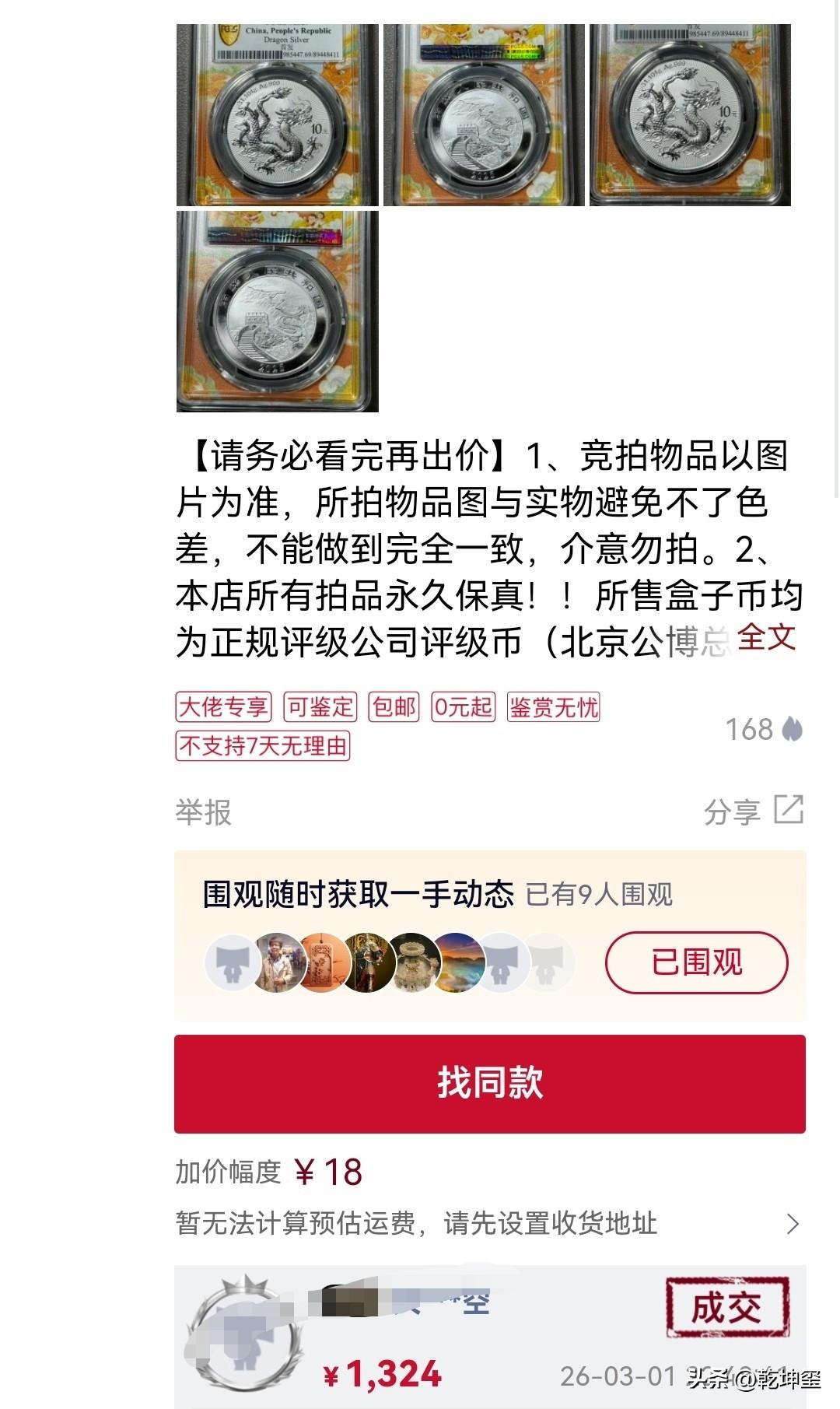 一枚2025年的新银元,价值超过了一枚100年前的袁大头银元的价值? 2月21日在某拍堂成交了一枚2025年发行的龙洋,经过多次竞拍,最后以1324元成交,比普通袁大头的价值都高?中国人爱龙,众所周知,但是也不至于价格高于100多年前的袁大头银元呀?不管怎么样说,袁大头银元也是古董呀?银元辨别方法 银元鉴定技巧 银元价值探寻 银元版别价值 晚清民国银元
