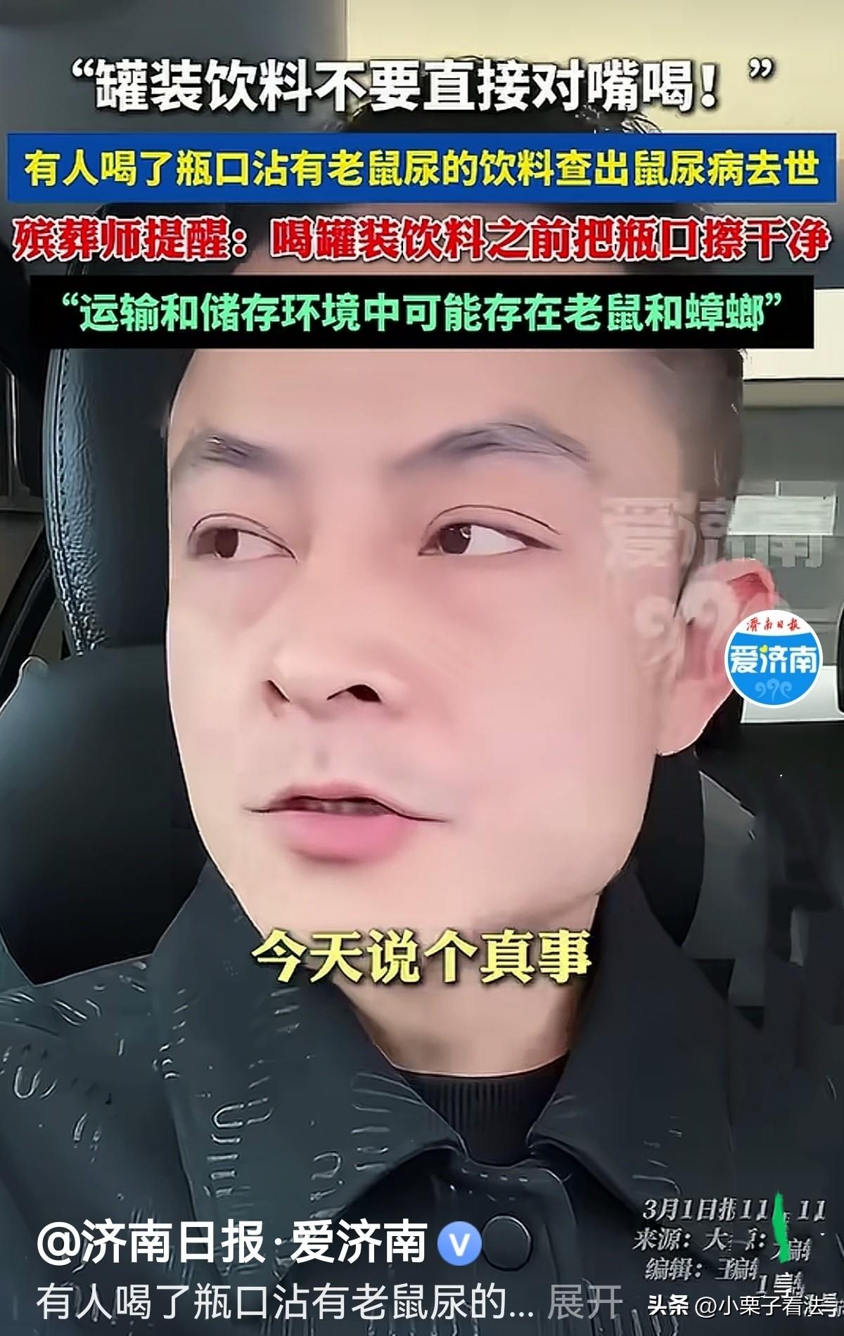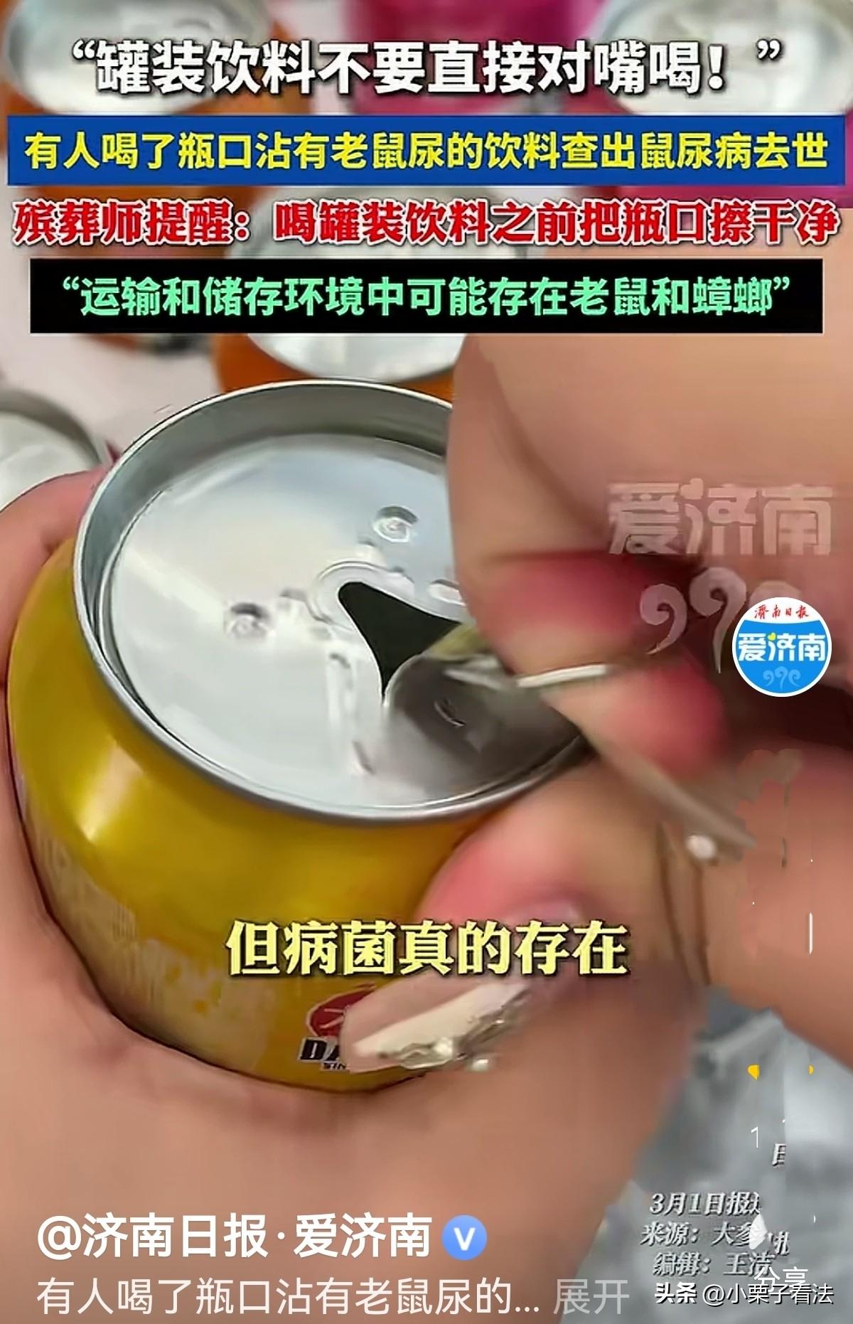 男子是做殡葬工作的,之前他接到一办殡仪的逝者,从发病到走只用了一个星期,一开始就喝了一罐易拉罐的饮料,饮料本身没问题,可他喝时没擦瓶口直接对着嘴喝。发病后在医院检查才知得的是鼠尿病,后来不治身亡。男子提醒大家:很多易拉罐在仓库运输过程中会被蟑螂老鼠爬过,沾上老鼠尿,肉眼看不见,但病菌真的存在。奉劝大家一句,不管新的旧的,整箱子安装,喝之前一定要把瓶子擦干净!网友:几十亿瓶查出一个,中彩票的几率是它的几百倍。 男子干殡葬工作多年,见惯了生死离合。可他之前接触过到一办理殡仪的逝者,知道他的死因,让他不寒而栗。 这事得从一周前说起。那天早上,我们接到通知,要去接一位逝者,是个五十多岁的大叔,姓王。 家人说王大叔平时身体硬朗得很,天天晨练、打牌,谁也没想到,他只因喝了一瓶易拉罐饮料,就得了病。 王大叔那天锻炼完身体觉得有点热,就在家门口的小卖部买了一罐易拉罐饮料,他薅下拉环,对着嘴就咕咚咕咚一饮而尽。 当天下午,王大叔就开始发烧,浑身疼,以为是感冒,吃了点药就扛过去了。 可到了晚上,病情突然恶化,上吐下泻,整个人疼得直打滚。家人吓坏了,连夜送医。 然而,从发病到离世,仅仅过了七天。 医生最终给出的诊断结果,让所有人都倒吸一口凉气:钩端螺旋体病,也就是俗称的"鼠尿病"。 医生的话像一块石头砸进了平静的湖面:饮料本身没问题,但瓶口可能接触了老鼠尿液。 很多易拉罐在仓库、运输过程中,会被蟑螂、老鼠爬过甚至尿过。这些尿液里含有大量致病菌,一旦接触口腔黏膜,后果不堪设想。 王大叔就这样感染病菌,不治身亡。 男子作为殡葬从业者,经手过无数案例,有寿终正寝的,有意外离世的,但因为喝了一口没擦嘴的饮料而突然离世的,这还是头一回。 这件事背后的逻辑,细思极恐。 我们常说病从口入,但谁能想到,威险竟然藏在看似干净的易拉罐里? 王大叔的遭遇,给我们所有人都提了个醒:现代生活的便利背后,藏着我们肉眼看不见的卫生死角。 男子说:干我们这行,见多了因为钱、因为遗产、因为婆媳关系而反目的家庭。 王大叔的事,让我看到了另一种遗憾,因为一个不经意的疏忽,连好好喝口水这种小事,都成了永别。 他想给大家,尤其是过年期间喜欢囤货、喝罐装饮料的朋友,几句掏心窝子的话: 第一,囤货需谨慎,开封要清洁。 不管是新开封的一罐,还是整箱囤的饮料,喝之前,一定要擦一擦瓶口! 尤其是那种放在角落、放了一段时间的饮料。 运输、储存过程中,瓶口接触到灰尘、老鼠尿液、蟑螂排泄物的概率,比我们想象的大得多。 第二,别忽视看不见的风险。 很多人觉得,我都喝了这么多年也没事,但风险不发生在自己身上,永远是概率。看不见的细菌不是不存在! 王大叔的案例就是警钟,一次侥幸,可能就是一生的遗憾。 第三,生命无常,珍惜当下。 王大叔的故事也让我想到,我们总觉得时间还多,总把改天、以后,挂在嘴边。 但其实,能和家人一起喝杯干净的饮料,能平安地吃一顿饭,就是最大的福气。 干殡葬久了,我最大的感悟就是:没有什么比好好活着更重要。 有人说问个问题啊!以前很多老鼠吃的粮食,老辈人舍不得扔了!照样吃!也没啥!!老鼠吃过的人吃了,没啥!现在咋病多人也娇贵了呢! 有人说,现在的易拉罐上面,一般都有保护套,常见牌子从出场就会加装了! 还有人说,更恶心的是现在很多易拉罐的环拉不下来,拉开半截直接泡进饮料里,特别不卫生,简直反人类设计! 一个小小的习惯,可能就能避免一场巨大的悲剧。从今天起,喝饮料,先擦瓶口。这不是小题大做,这是对生命最基本的尊重。 愿大家都能平安顺遂,远离无妄之灾,珍惜眼前人。 对此您怎么看?