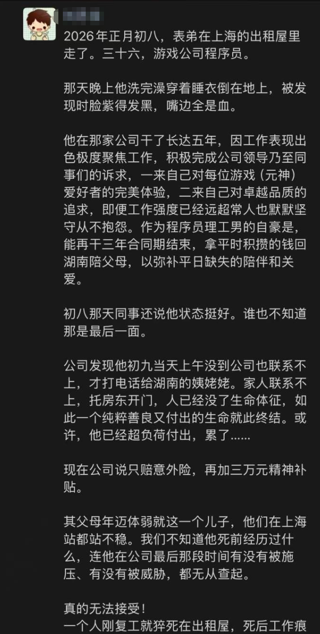 据悉,在正月初八下班后,当事人在上海出租屋内不幸离世,并于初九上午被发现。
