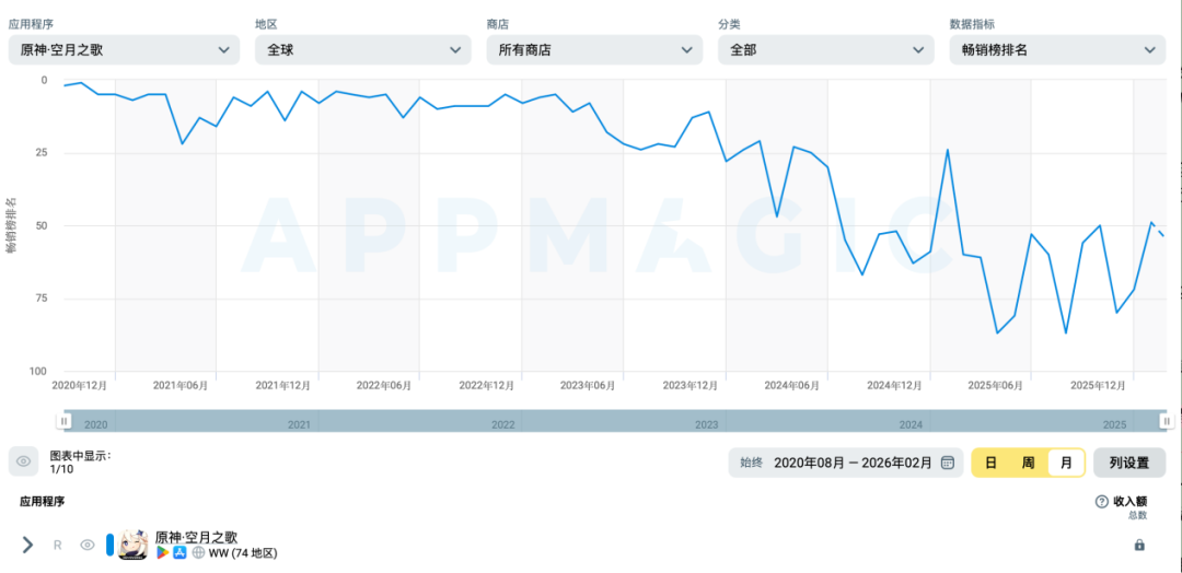 据移动应用市场研究机构AppMagic数据,自2023年末起,《原神》在全球畅销榜的排名便常年位列前25名开外,与前些年稳居前10名的高光时刻形成巨大反差。