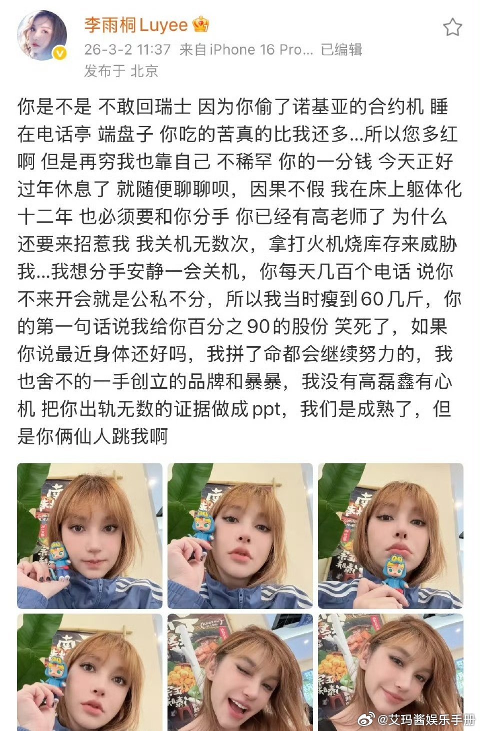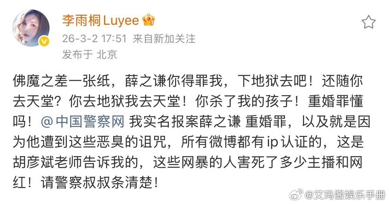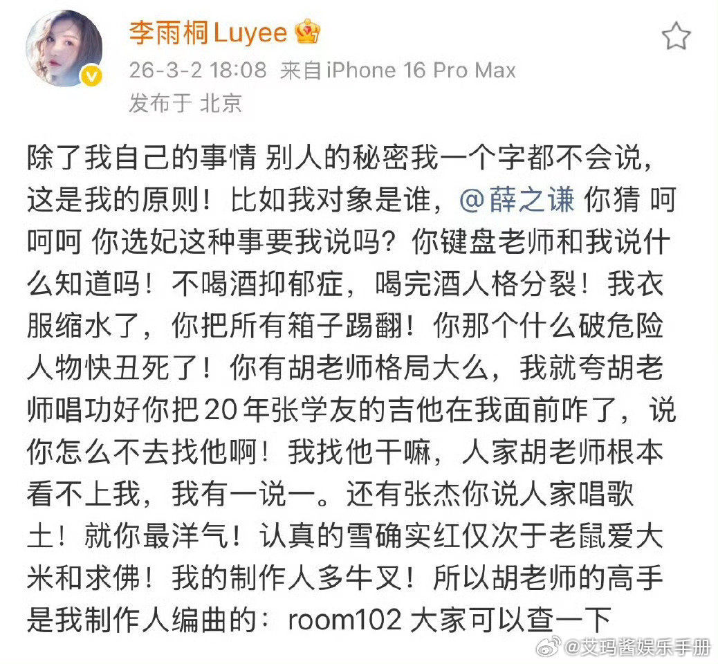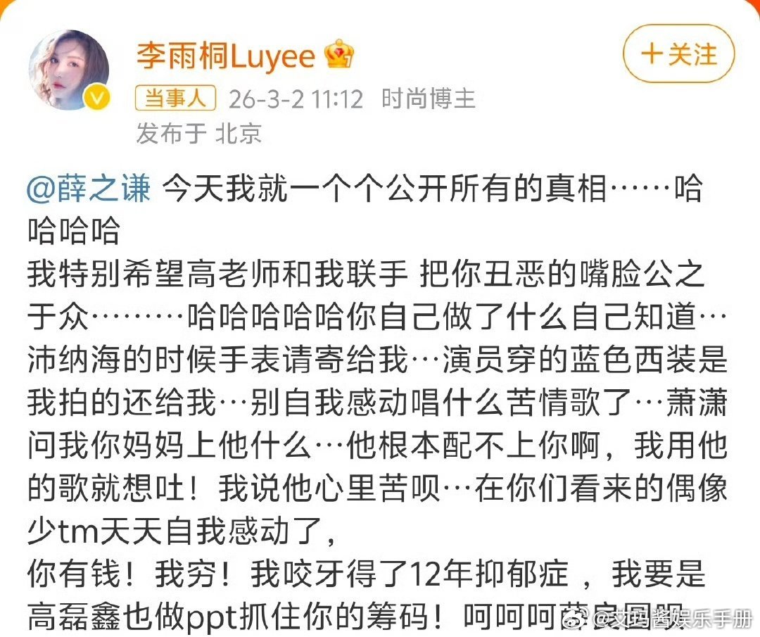 盘点今日李雨桐爆料薛之谦🍉!1、李雨桐喊话薛之谦:想要联合高磊鑫一起揭开他的真面目!2、要求薛之谦归还她的手表,蓝色西装等物品3、随后李雨桐称自己没留证据,开玩笑的4、李雨桐实名举报薛之谦重婚罪,还说是胡彦斌告诉我的5、李雨桐称薛之谦说张杰唱歌土6、李雨桐提到薛之谦选妃7、李雨桐夸胡老师唱功好,薛之谦听了把张学友的吉他砸了8、李雨桐说薛之谦高磊鑫仙人跳她李雨桐 薛之谦说张杰唱歌土李雨桐喊话薛之谦李雨桐 胡彦斌告诉我的薛之谦 选妃李雨桐实名报案薛之谦重婚罪