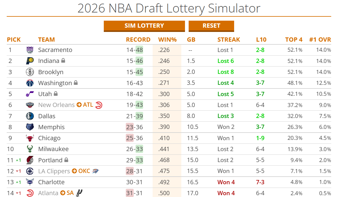 数据网站Tankathon列出了今年乐透区域各队的选秀抽签概率,其中国王、步行者与篮网(战绩最差三队)各自拥有14%的最高状元概率。