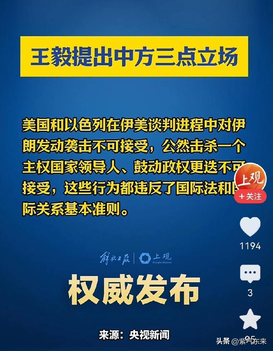 美国和以色列看到中国政府的表态 估计脸都气绿了 王毅外长指责美国和以色列违反国际法和国际关系准则,在谈判期间公然袭击伊朗,并且杀害伊朗主权国家的领导人,试图让伊朗政权迭代的做法不可接受! 东大的王毅外长鲜明的表达了三点立场 1 立即停止军事行动 2 尽快重回对话谈判 3 反对单边行径 无论美国和以色列理不理会,但是作为负责任的大国,要表明自己的立场!中国外长