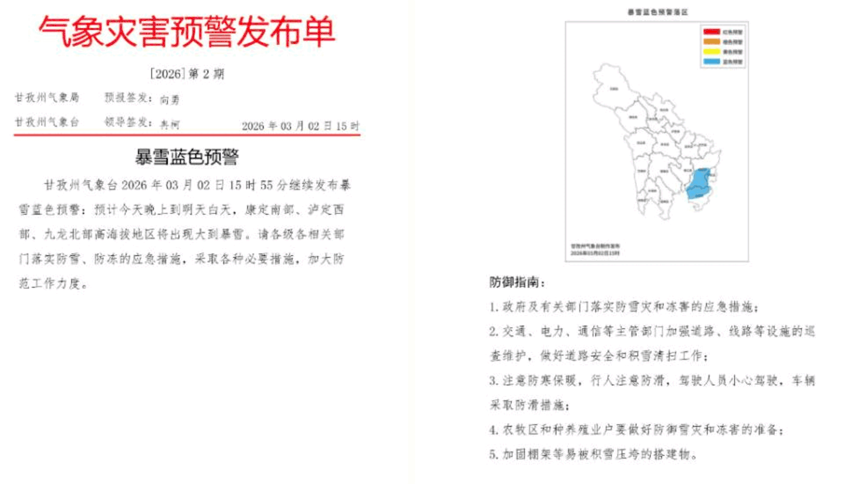 今天(3月2日)下午,甘孜州、九龙县、泸定县气象台继续发布暴雪蓝色预警。