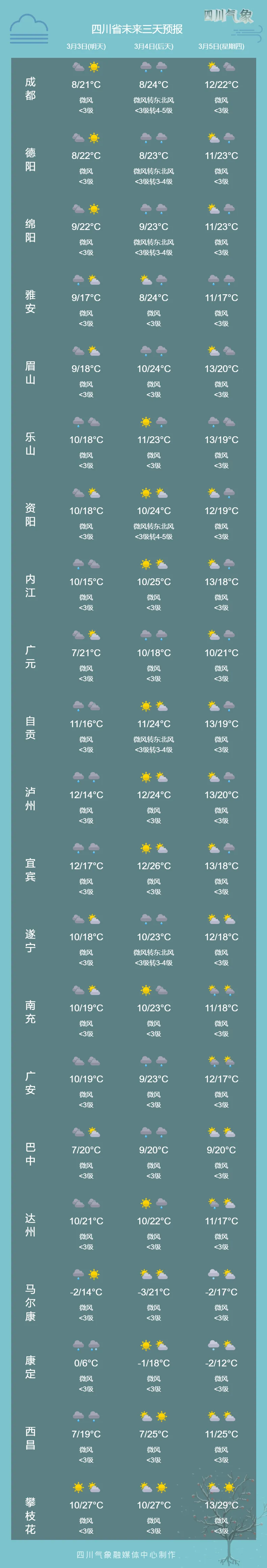 3日晚上到4日白天,雅安、宜宾、泸州3市和乐山南部阴天间多云,早晚有小雨或零星小雨,盆地其余地方晴间多云,部分地方早上有雾;川西高原东部边缘地区和凉山州中部东部阵雨或阵雪转多云,川西高原大部和攀西地区其余地方多云到晴。