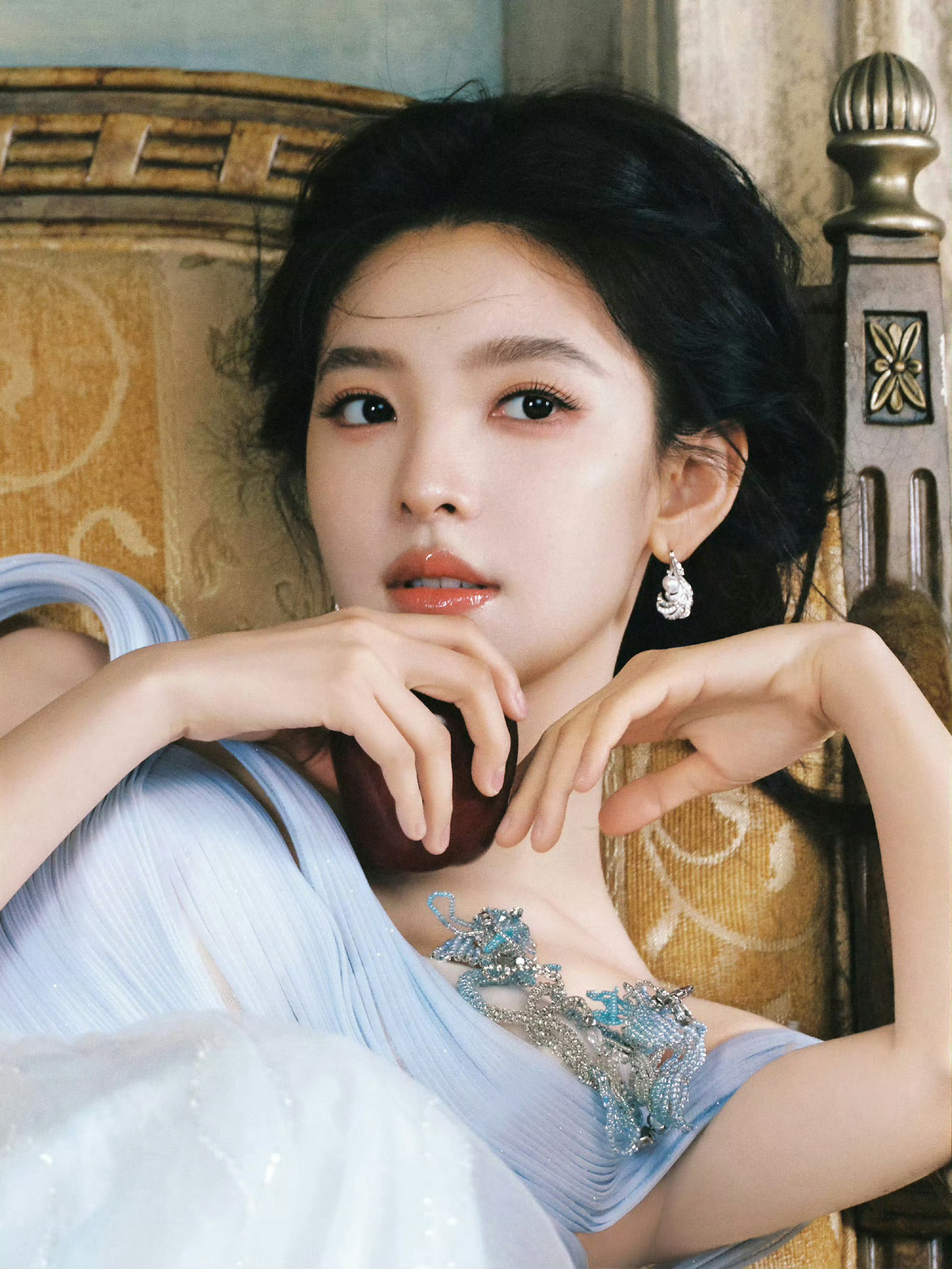 章若楠蓝色梦幻灵动公主风章若楠亮相直播现场,身着秋冬系列的淡蓝色薄纱礼裙,搭配超