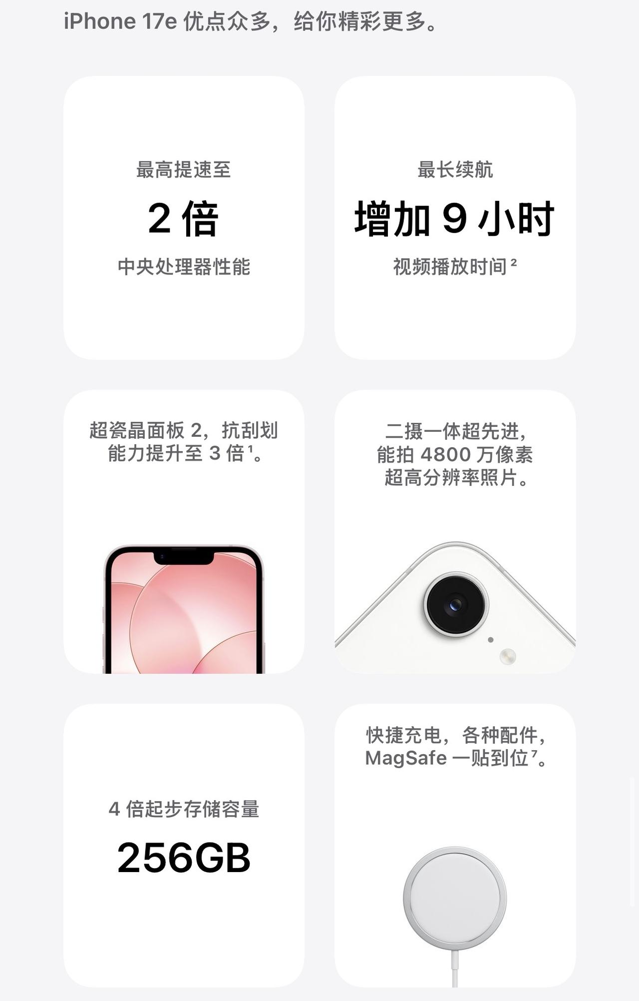 苹果春季新品来了,今晚先上架的是iPhone 17e手机和iPad Air(M4)平板,售价分别是4499元起和4799元起,起步价相比上一代均没有变化!需要特别补充的是,iPhone 17e是256GB起步了,对比iPhone 16e的同容量版本,便宜了1000元!512GB版本也便宜了千元。 不过由于256GB版本预计还能享受国补优惠,iPhone 17e两款容量版本的到手价相差2500元,显然256GB会更划算,512GB版暂时慎入吧。 当前行业内存涨价如此猛,苹果依然是走稳健路线,逆势不涨价,看来是真的给消费者让利了,借此扩大市场份额,恐怕会对一众友商形成暴击。 iPhone 17e将于3月11日上市,有黑、白、粉三款颜色,采用iPhone 17同款的苹果A19芯片,处理器性能至高提速到2倍。屏幕为6.1英寸OLED,正面为刘海屏,配备超瓷晶面板2,厚度7.8毫米,重量170克,依然为后置单摄像头,屏幕刷新率60Hz。 该机的前后双摄分别为1200万像素和4800万像素,新增支持15W磁吸无线充电,采用nano-SIM和eSIM双卡,支持双eSIM。苹果称iPhone 17e播放视频的续航时长相比上代增加长达9小时。iPhone 17e