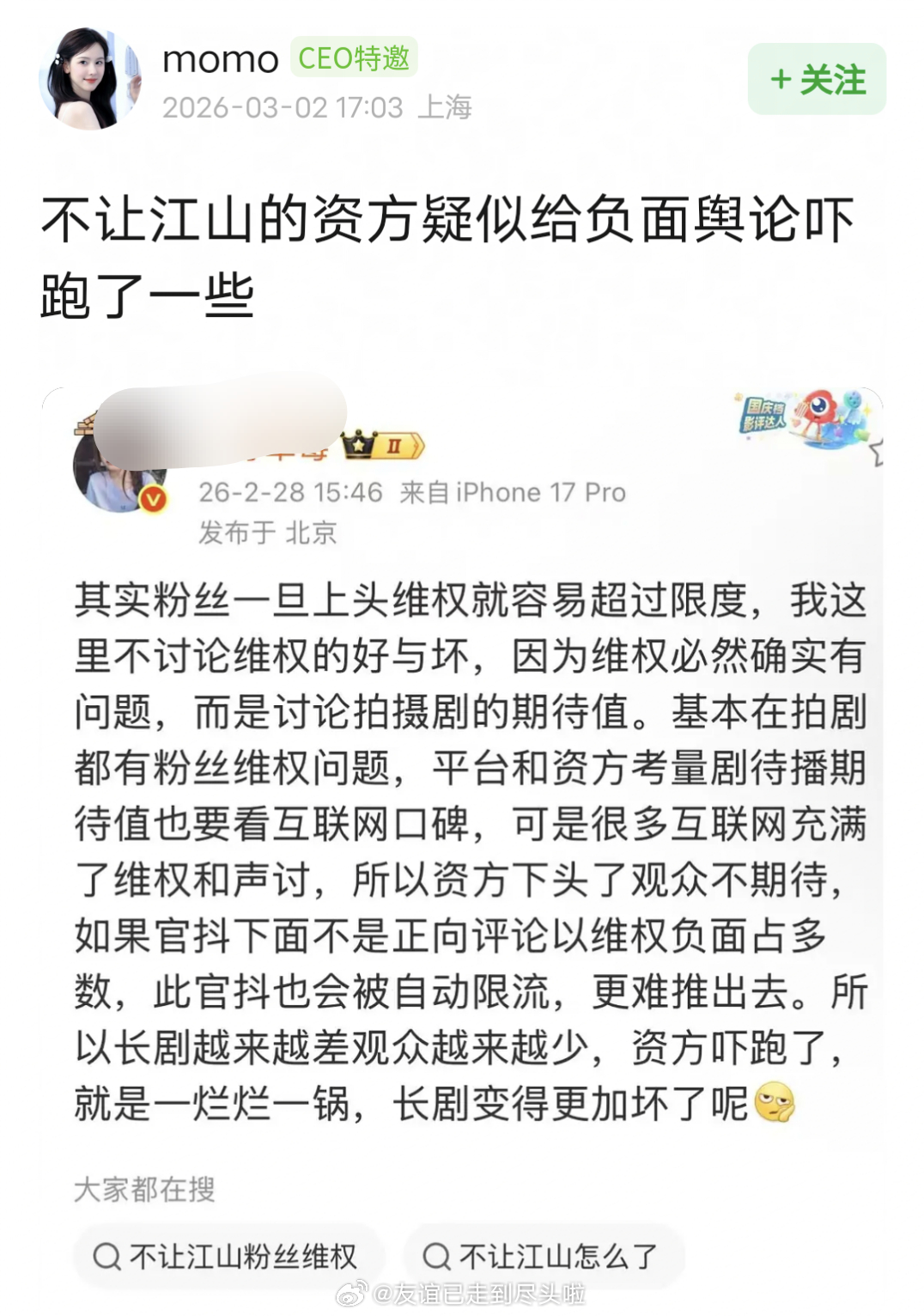 瓜主爆料粉丝维权会吓跑资方,互联网口碑很重要,维权超过限度会让资方下头,观众也不
