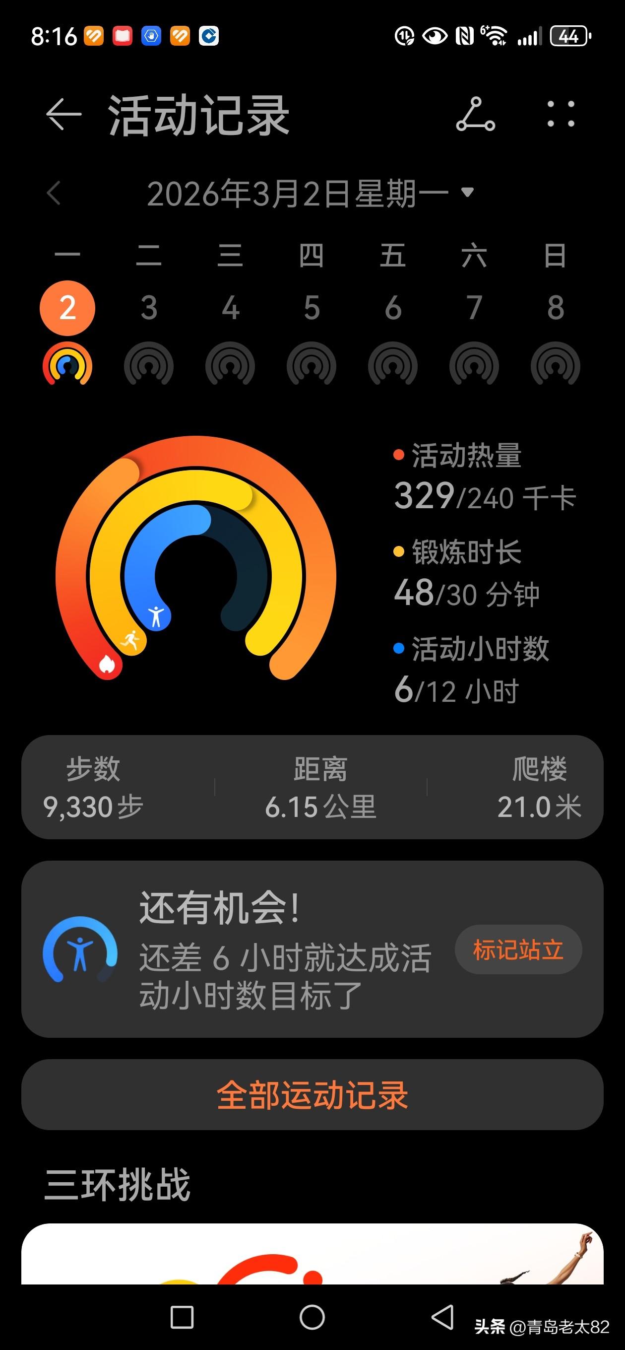 坚持慢跑加散步,今天成绩如下:共9330步,合6.15公里,活动热量329千卡,超额完成了每天6000步的小目标,为自己加油!耄耋老人的锻炼日常 好好爱自己 坚持的样子最美