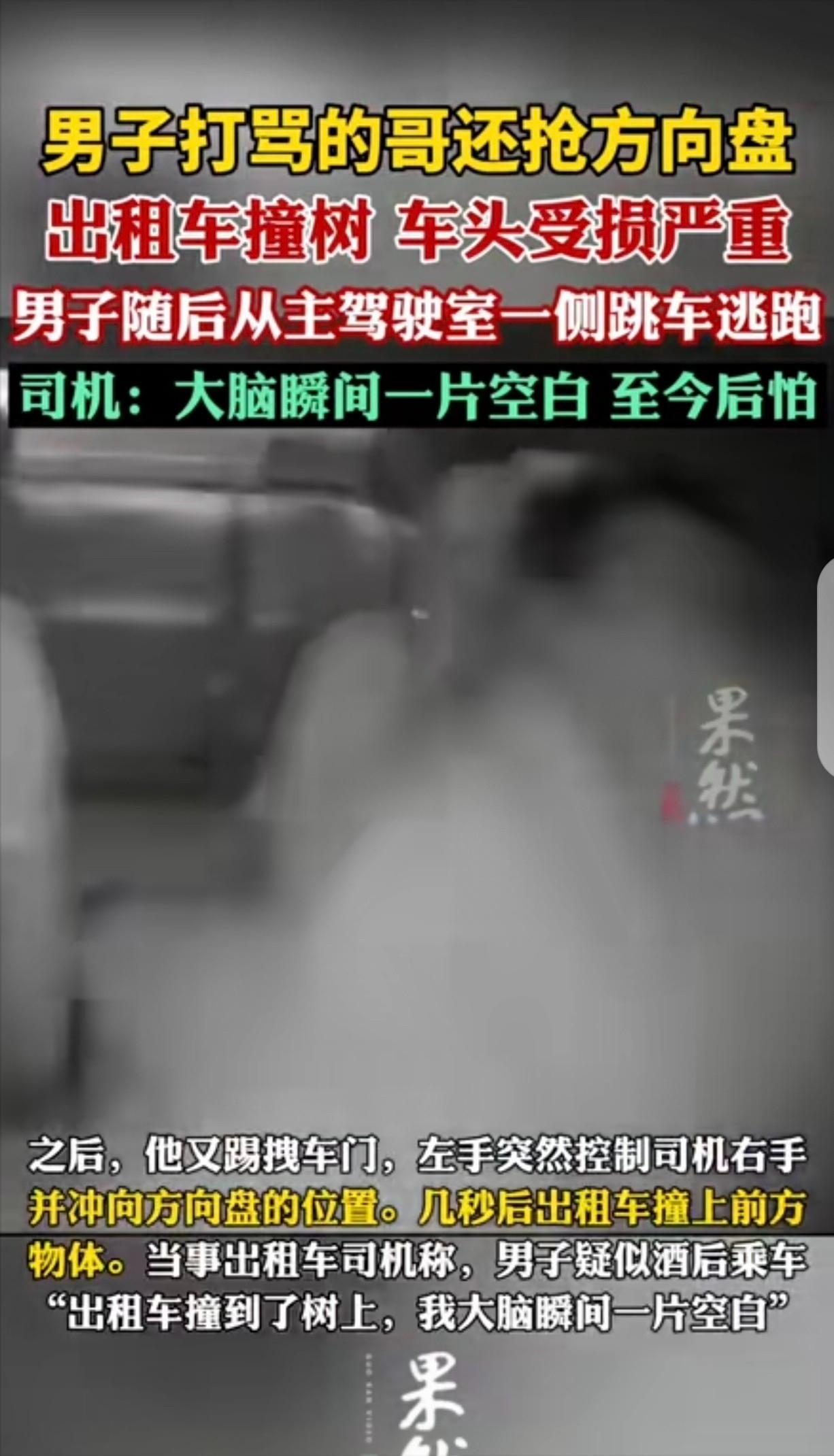 “酒壮怂人胆!”甘肃,一男子打出租车,跟司机炫耀:我打牌一局上万元,你能打几局?司机一看男子莫名其妙,也没搭理他,男子直接火了,骂司机是“怂货!”还用手打司机的头,说要揍死他,问司机信不信?然后,男子竟疯狂抢司机方向盘,导致出租车撞树上,车头撞的面目全非,好在司机身体无大碍。男子一看不好,跳车仓皇逃跑了。司机开了2年出租车,第一次遇到这事,至今后怕不已,他愤怒的报了警,结局悲剧了。 跑夜班出租的司机,大多都有个共识:最麻烦的不是路远,也不是堵车,而是喝多了的乘客。 情绪不稳定、说话没分寸,还容易做出出格举动,有人觉得忍一忍就过去了,但有时候,风险就在那几秒钟里。 事情发生在临洮,张阳在当地开出租已经两年多,主要跑夜班,那天晚上10点多,他像往常一样在路边接单。 行车记录仪显示时间是22点30分左右,一名男子上了副驾驶,车门一关,车里立刻弥漫着明显的酒味。 起初只是言语挑衅,对方反复强调自己打牌“输赢上万”,语气里带着炫耀和轻蔑,张阳没有接话,专心开车,他清楚,和醉酒的人争辩没有意义,安全把人送到目的地才是正事。 但沉默并没有让事情平息,对方情绪越来越激动,开始辱骂,随后突然动手,拍打张阳头部。 眼镜被打歪,车子也出现轻微晃动,张阳没有还手。一方面是担心矛盾升级,另一方面也顾虑行业管理规定,一旦发生冲突,很可能要停运处理。 真正的危险,发生得很突然,车辆还在行驶过程中,那名男子突然解开安全带,从副驾驶位置探身过来,双手抓住方向盘用力拉扯。 夜间路面本就视线有限,车辆瞬间偏离路线,张阳下意识踩刹车,但已经来不及,车头撞上路边行道树。 安全气囊弹出,玻璃碎裂,张阳被安全带勒住,胸口发闷,一时反应不过来,副驾驶一侧车门受损变形,那名男子受伤流血,却很快从驾驶位一侧爬出车外,离开现场。 事故发生后,张阳第一时间报警,警方调取周边监控视频,结合车辆行车记录仪画面进行排查,约20天后,在一家诊所内找到正在治疗肋骨伤的嫌疑人,并将其带回调查。 事发后,网络上出现过各种猜测,说当事人有特殊身份,当地相关部门随后发布通报,明确表示其为普通居民,并无所谓“特殊背景”,案件没有按一般治安纠纷处理,而是由刑侦部门立案侦查。 从法律角度看,在车辆行驶过程中抢夺方向盘,属于严重危及公共安全的行为,根据《中华人民共和国刑法》相关条款,可能涉及“以危险方法危害公共安全罪”以及“妨害安全驾驶罪”。 前者量刑较重,具体判罚需结合后果、主观恶性以及是否存在逃逸等情节综合判断。 有律师分析,即便事后进行民事赔偿、取得谅解,也只是量刑时的从轻因素,并不能改变案件的性质。 醉酒状态不会被视为免责理由,相反,如果行为人明知自己饮酒仍实施危险举动,可能被认定为具有明显过错。 对张阳来说,事故带来的影响,并不只是车辆损坏,车修好后,他一度不敢继续跑夜班。 那几秒钟的失控画面,反复出现在脑海里,方向盘被强行拉偏时的无力感,让他心有余悸,他把行车记录仪视频交给警方后,就再没勇气完整看一遍。 这起事件再次提醒,酒后失控行为不仅伤害他人,也可能给自己带来沉重代价,车辆行驶过程中任何干扰驾驶的举动,都可能酿成严重后果。 对司机而言,安全是底线;对乘客而言,克制同样是责任,几句逞强的话,也许只是一时口快,但一旦跨过法律红线,后果往往无法挽回。