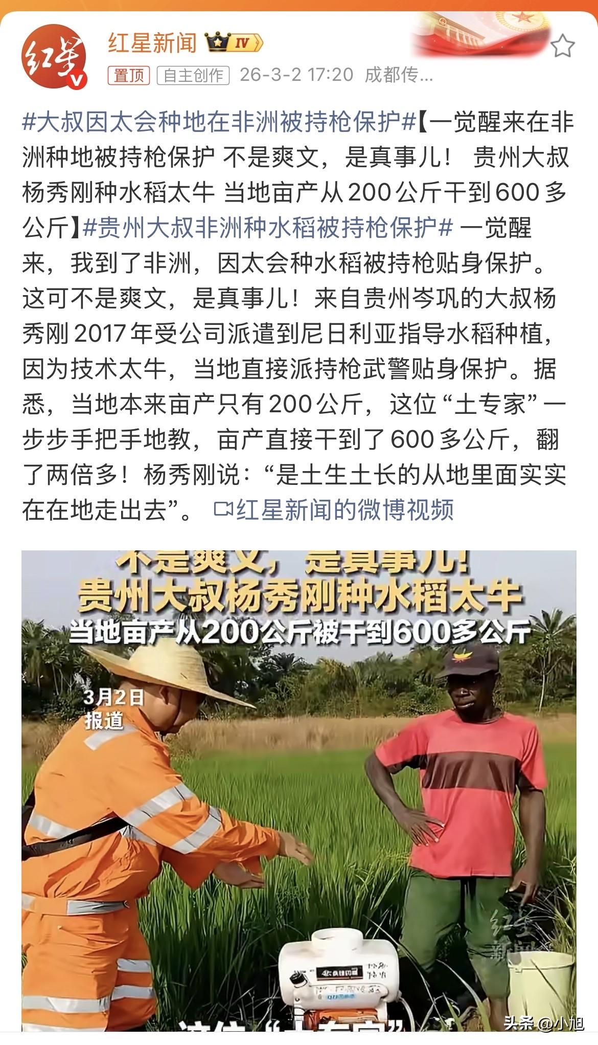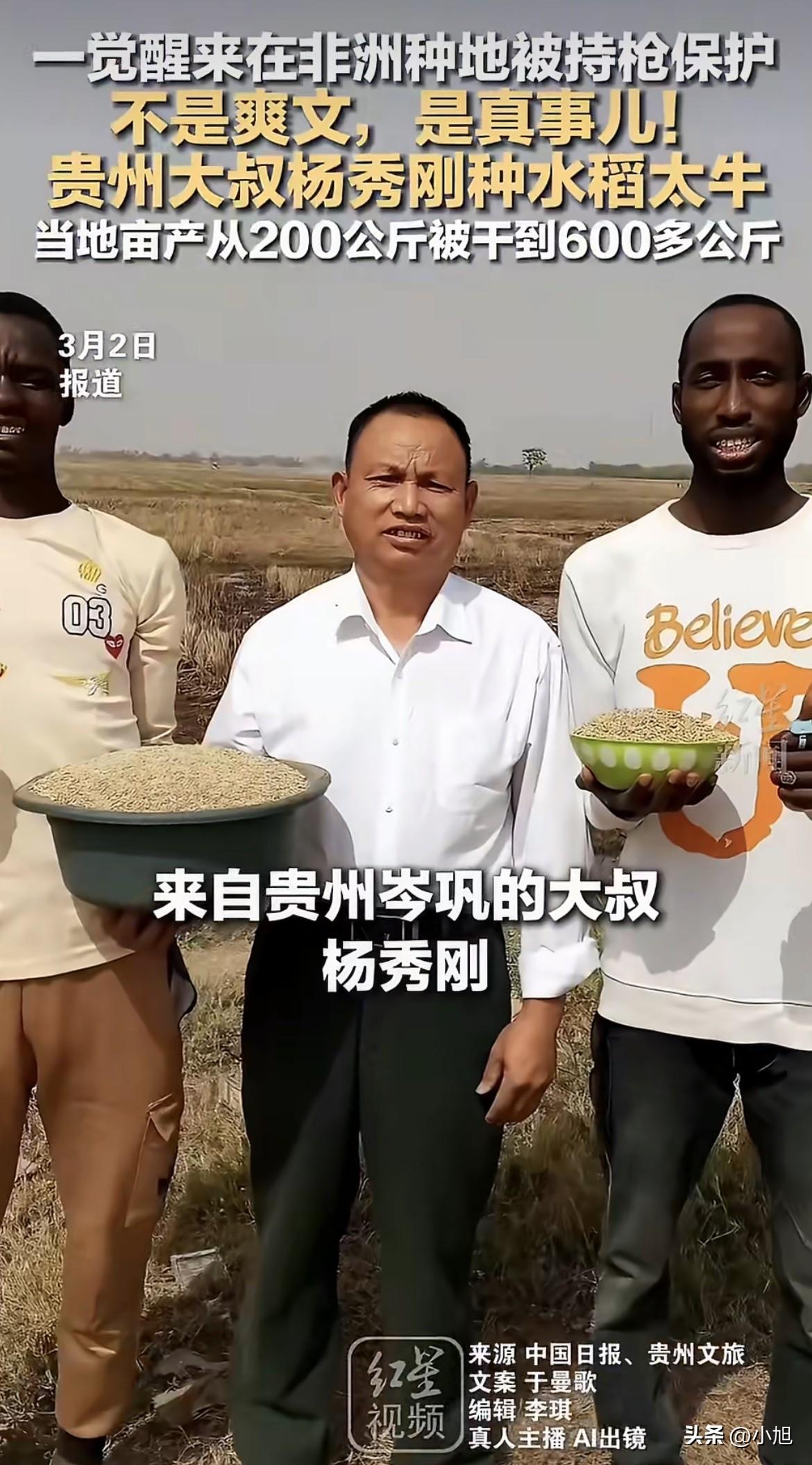 万万没想到!一个贵州农民,在非洲下地干活,旁边站着个扛枪的武警专门保护他。 这不是哪个公司高管,也不是去援建的工程师,就是贵州岑巩一个土生土长的农民,叫杨秀刚。2017年他受公司派遣去尼日利亚指导种水稻,去了才发现,当地一亩地才收200来公斤。 老杨在老家种了大半辈子地,岑巩是国家级杂交水稻种子生产基地,那里的人天生就跟种子打交道。他到了尼日利亚吉加瓦州,住的是集装箱改的宿舍,热得要命,蚊子多得能把你抬起来。但这都不算啥,真正让他头疼的是,当地农民种地的方式实在太原始了。 老杨只能从头教起。怎么整地,什么时候育苗,啥时候施肥,水该放多少,他卷起裤腿下田,手把手地教。据贵州日报2025年的报道,有一回下大雨,秧苗被积水泡了,老杨急得赶紧带人排涝,那些秧苗是他花了几年时间培育出来的新品种,宝贝得不行。 慢慢地,奇迹出现了。原来那亩产200公斤的地,蹭蹭涨到了600多公斤,有的地块甚至能到650公斤。当地人直接管他带来的种子叫"金种子"。以前不少人家里吃杂粮,现在能吃上自己种的大米了。 产量翻了两倍多,这事在当地炸了锅。老杨工作的基地靠近边境,安全形势复杂,尼日利亚政府二话不说,直接给他配了个持枪武警,24小时跟着。用当地人的话说:"这是请来的专家教授,必须保护好。" 老杨不光教技术,还学当地话。到后来,他已经能直接用地道的土话跟黑兄弟们在田里交流了。有个叫乌丝满的小伙,2023年开始跟着他学,从育苗到病虫害防治,老杨一项项教,乌丝满学得认真,说以后要把技术教给更多人。 据新华网报道,老杨这些年出国搞技术,手把手带出了12个外国徒弟。他说,在非洲这几年,最大的成就感不是产量上去了,是看到当地人从吃不饱到能吃饱,现在正琢磨着怎么帮他们发家致富。 写到这里我就想,现在一说专家,很多人想到的是头衔、论文、实验室。但老杨这样的,连个大学文凭都没有,愣是让非洲的土地产量翻三倍,当地政府心甘情愿派武警扛枪保护。你说,啥叫真本事?这不就是吗? 对于杨秀刚这样的"土专家",你怎么看?欢迎在评论区聊聊。
