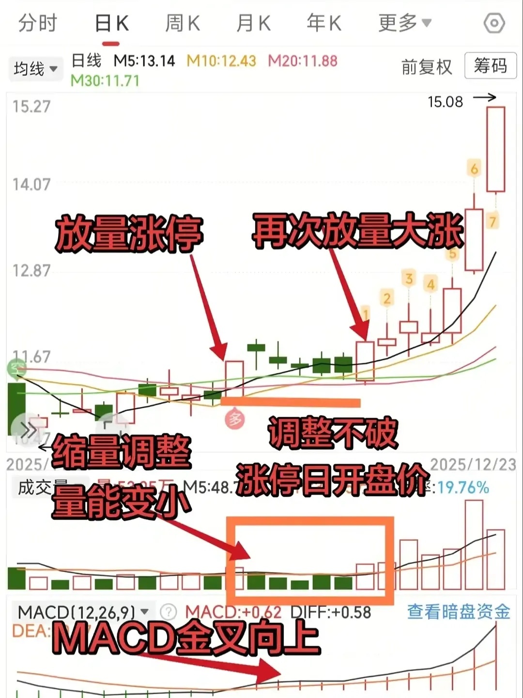 1. 找信号:先有放量涨停阳线,代表主力进场。2. 看回调:回调时不跌破涨停日开盘价或关键支撑位,且量能持续萎缩,说明抛压小、主力未走。3. 抓买点:股价再次放量突破回调高点,配合MACD金叉,可择机入场。4. 防风险:若回调放量跌破关键位,形态失败,需及时止损。